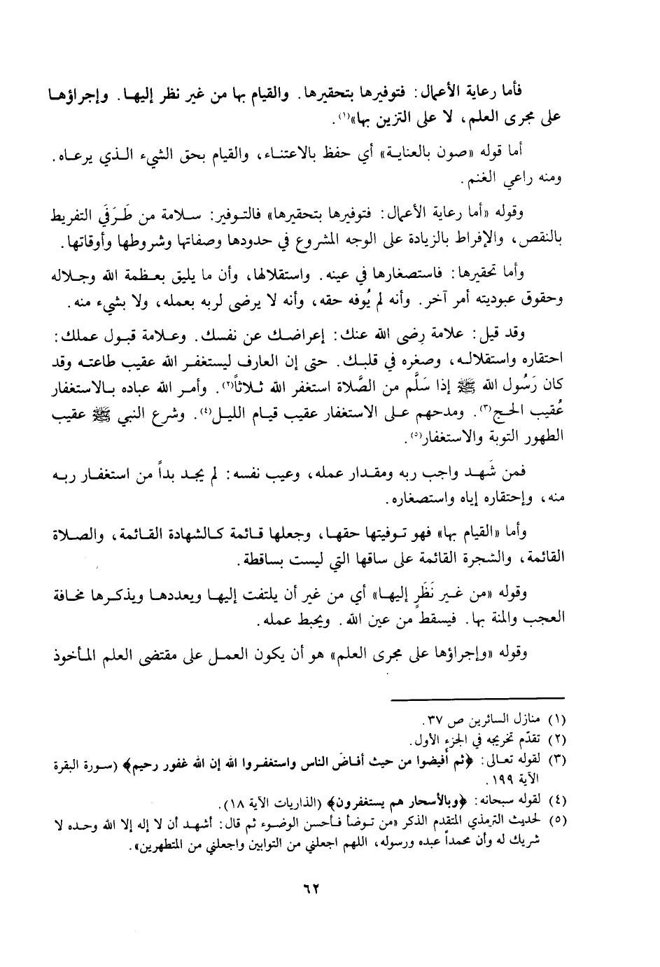 فَأَمَّا رِعَايَةُ الْأَعْمَالِ فَتَوْفِيرُهَا بِتَحْقِيرِهَا. وَالْقِيَامُ بِهَا مِنْ غَيْرِ نَظَرٍ إِلَيْهَا. وَإِجْرَاؤُهَا عَلَى مَجْرَى الْعِلْمِ، لَا عَلَى التَّزَيُّنِ بِهَا.