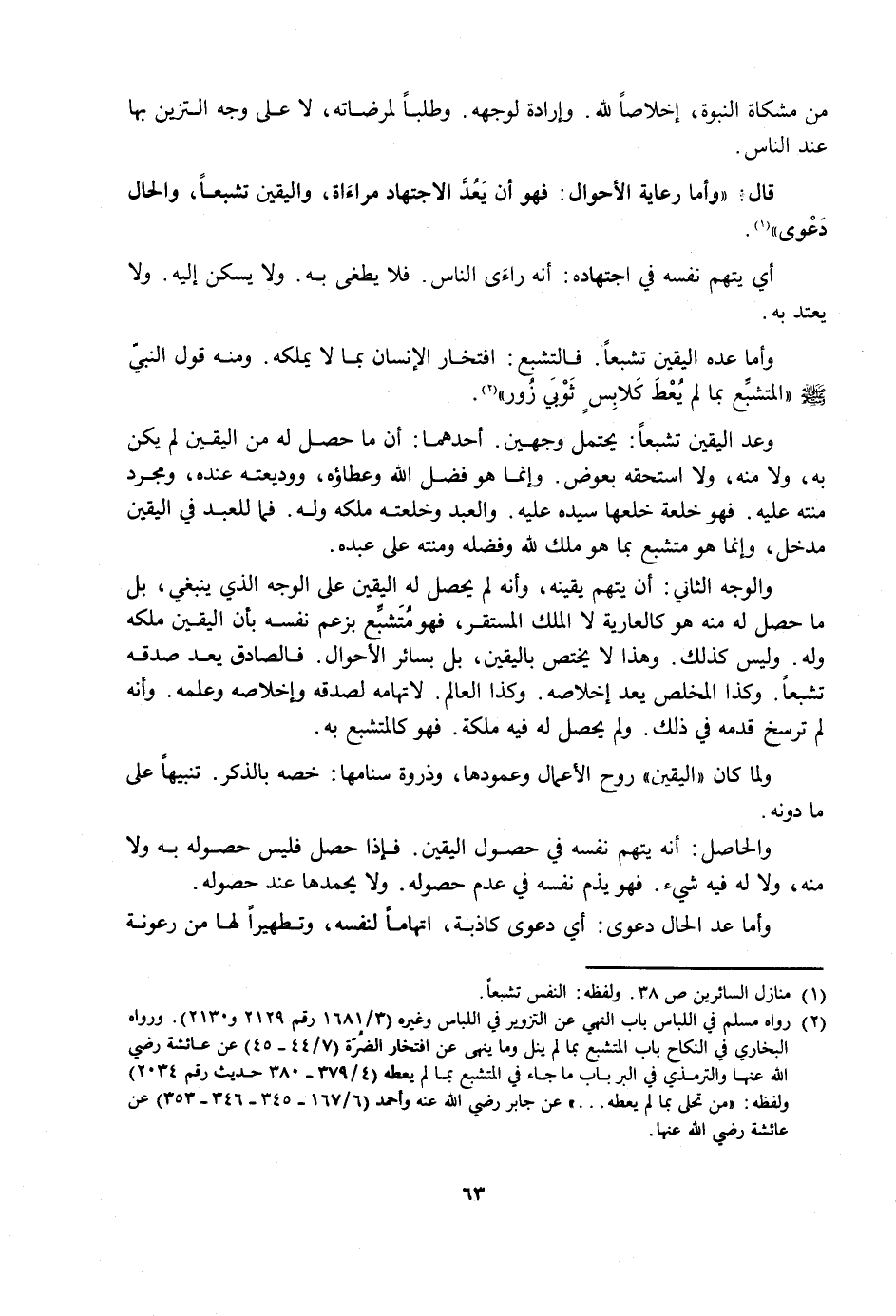 قَالَ: وَأَمَّا رِعَايَةُ الْأَحْوَالِ الدَّرَجَةُ الثَّانِيَةُ مِنْ دَرَجَاتِ الرِّعَايَةِ فَهُوَ أَنْ يَعُدَّ الِاجْتِهَادَ مُرَاءَاةً، وَالْيَقِينَ تَشَبُّعًا، وَالْحَالَ دَعْوَى.