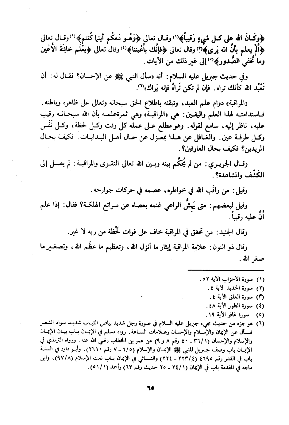 الْمُرَاقَبَةُ تَعْرِيفُهَا: دَوَامُ عِلْمِ الْعَبْدِ، وَتَيَقُّنِهِ بِاطِّلَاعِ الْحَقِّ سُبْحَانَهُ وَتَعَالَى عَلَى ظَاهِرِهِ وَبَاطِنِهِ. فَاسْتَدَامَتُهُ لِهَذَا الْعِلْمِ وَالْيَقِينِ هِيَ الْمُرَاقَبَةُ وَهِيَ ثَمَرَةُ عِلْمِهِ بِأَنَّ اللَّهَ سُبْحَانَهُ رَقِيبٌ عَلَيْهِ، نَاظِرٌ إِلَيْهِ، سَامِعٌ لِقَوْلِهِ. وَهُوَ مُطَّلِعٌ عَلَى عَمَلِهِ كُلَّ وَقْتٍ وَكُلَّ لَحْظَةٍ، وَكُلَّ نَفَسٍ وَكُلَّ طَرْفَةِ عَيْنٍ. وَالْغَافِلُ عَنْ هَذَا بِمَعْزِلٍ عَنْ حَالِ أَهْلِ الْبِدَايَاتِ. فَكَيْفَ بِحَالِ الْمُرِيدِينَ؟ فَكَيْفَ بِحَالِ الْعَارِفِينَ؟ .