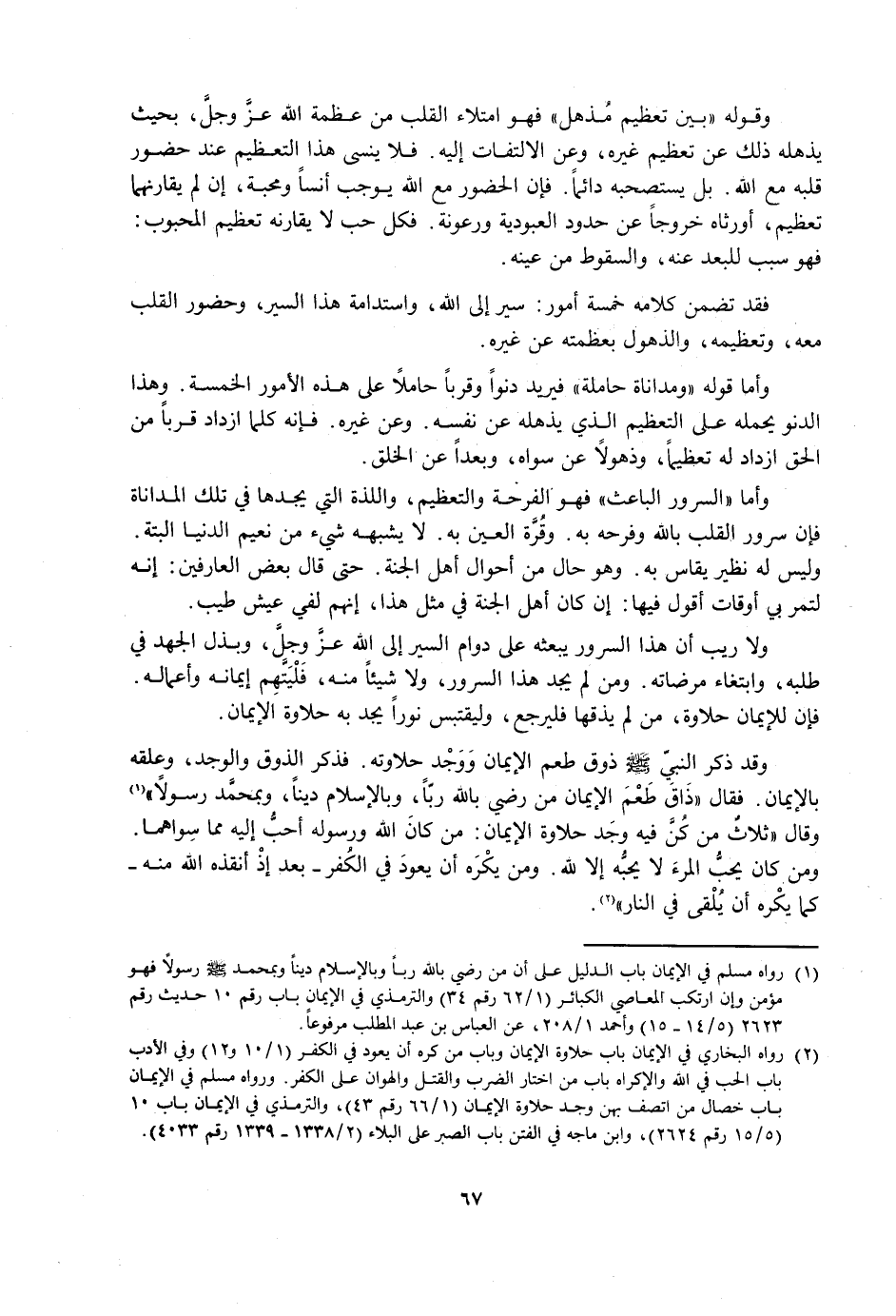 وَلَا رَيْبَ أَنَّ هَذَا السُّرُورَ يَبْعَثُهُ عَلَى دَوَامِ السَّيْرِ إِلَى اللَّهِ عَزَّ وَجَلَّ، وَبَذْلِ الْجُهْدِ فِي طَلَبِهِ، وَابْتِغَاءِ مَرْضَاتِهِ، وَمَنْ لَمْ يَجِدْ هَذَا السُّرُورَ، وَلَا شَيْئًا مِنْهُ، فَلْيَتَّهِمْ إِيمَانَهُ وَأَعْمَالَهُ. فَإِنَّ لِلْإِيمَانِ حَلَاوَةً، مَنْ لَمْ يَذُقْهَا فَلْيَرْجِعْ، وَلْيَقْتَبِسْ نُورًا يَجِدُ بِهِ حَلَاوَةَ الْإِيمَانِ.