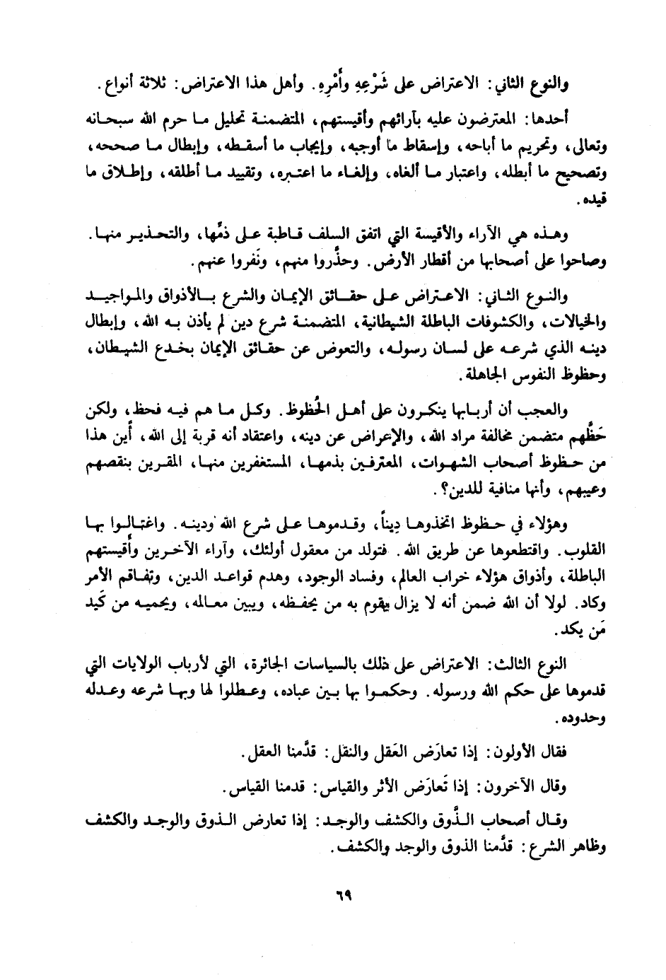 النَّوْعُ الثَّانِي: الِاعْتِرَاضُ عَلَى حَقَائِقِ الْإِيمَانِ وَالشَّرْعِ بِالْأَذْوَاقِ وَالْمَوَاجِيدِ وَالْخَيَالَاتِ، وَالْكُشُوفَاتِ الْبَاطِلَةِ الشَّيْطَانِيَّةِ، الْمُتَضَمِّنَةِ شَرَعَ دِينٍ لَمْ يَأْذَنْ بِهِ اللَّهُ، وَإِبْطَالَ دِينِهِ الَّذِي شَرَعَهُ عَلَى لِسَانِ رَسُولِهِ، وَالتَّعَوُّضَ عَنْ حَقَائِقِ الْإِيمَانِ بِخُدَعِ الشَّيْطَانِ وَحُظُوظِ النُّفُوسِ الْجَاهِلَةِ.