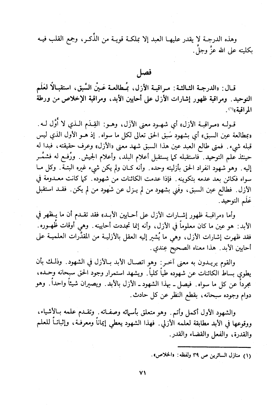 قَوْلُهُ: مُرَاقَبَةُ الْأَزَلِ؛ أَيْ شُهُودُ مَعْنَى الْأَزَلِ، وَهُوَ الْقِدَمُ الَّذِي لَا أَوَّلَ لَهُ بِمُطَالَعَةِ عَيْنِ السَّبْقِ؛ أَيْ بِشُهُودِ سَبْقِ الْحَقِّ تَعَالَى لِكُلِّ مَا سِوَاهُ؛ إِذْ هُوَ الْأَوَّلُ الَّذِي لَيْسَ قَبْلَهُ شَيْءٌ. فَمَتَى طَالَعَ الْعَبْدُ عَيْنَ هَذَا السَّبْقِ شَهِدَ مَعْنَى الْأَزَلِ وَعَرَفَ حَقِيقَتَهُ، فَبَدَا لَهُ حِينَئِذٍ عِلْمُ التَّوْحِيدِ، فَاسْتَقْبَلَهُ كَمَا يَسْتَقْبِلُ أَعْلَامَ الْبَلَدِ، وَأَعْلَامَ الْجَيْشِ. وَرُفِعَ لَهُ فَشَمَّرَ إِلَيْهِ. وَهُوَ شُهُودُ انْفِرَادِ الْحَقِّ بِأَزَلِيَّتِهِ وَحْدَهُ. وَأَنَّهُ كَانَ وَلَمْ يَكُنْ شَيْءٌ غَيْرُهُ أَلْبَتَّةَ. وَكُلُّ مَا سِوَاهُ فَكَائِنٌ بَعْدَ عَدَمِهِ بِتَكْوِينِهِ. فَإِذَا عَدِمَتِ الْكَائِنَاتُ مِنْ شُهُودِهِ، كَمَا كَانَتْ مَعْدُومَةً فِي الْأَزَلِ. فَطَالَعَ عَيْنَ السَّبْقِ، وَفَنِيَ بِشُهُودِ مَنْ لَمْ يَزَلْ عَنْ شُهُودِ مَنْ لَمْ يَكُنْ. فَقَدِ اسْتَقْبَلَ عِلْمَ التَّوْحِيدِ.