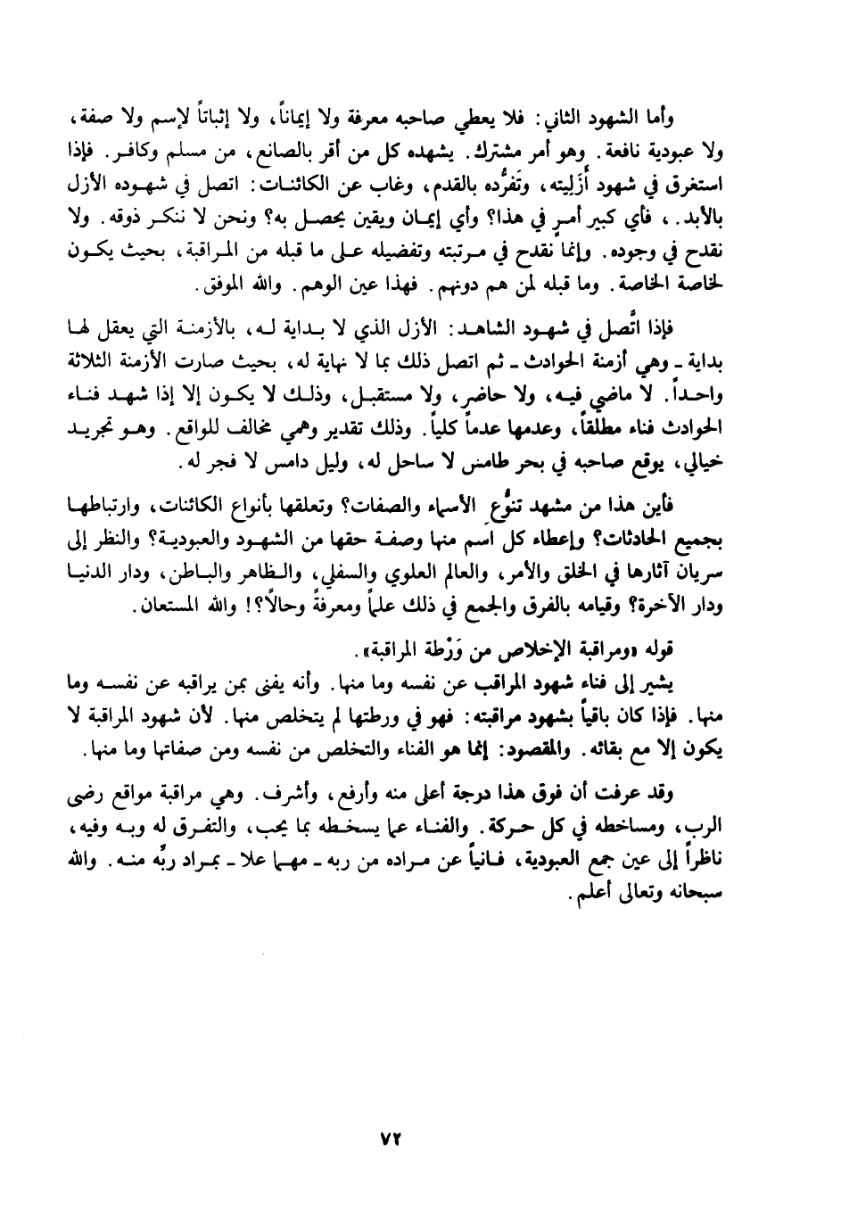 وَأَمَّا الشُّهُودُ الثَّانِي فَلَا يُعْطَى صَاحِبُهُ مَعْرِفَةً وَلَا إِيمَانًا، وَلَا إِثْبَاتًا لِاسْمٍ وَلَا صِفَةٍ، وَلَا عُبُودِيَّةٍ نَافِعَةٍ. وَهُوَ أَمْرٌ مُشْتَرَكٌ. يَشْهَدُهُ كُلُّ مَنْ أَقَرَّ بِالصَّانِعِ، مِنْ مُسْلِمٍ وَكَافِرٍ. فَإِذَا اسْتَغْرَقَ فِي شُهُودِ أَزَلِيَّتِهِ، وَتَفَرُّدِهِ بِالْقِدَمِ، وَغَابَ عَنِ الْكَائِنَاتِ، اتَّصَلَ فِي شُهُودِهِ الْأَزَلُ بِالْأَبَدِ. فَأَيُّ كَبِيرِ أَمْرٍ فِي هَذَا؟ وَأَيُّ إِيمَانٍ وَيَقِينٍ يَحْصُلُ بِهِ؟ وَنَحْنُ لَا نُنْكِرُ ذَوْقَهُ، وَلَا نَقْدَحُ فِي وُجُودِهِ؛ وَإِنَّمَا نَقْدَحُ فِي مَرْتَبَتِهِ وَتَفْضِيلِهِ عَلَى مَا قَبْلَهُ مِنَ الْمُرَاقَبَةِ، بِحَيْثُ يَكُونُ لِخَاصَّةِ الْخَاصَّةِ. وَمَا قَبْلَهُ لِمَنْ هُمْ دُونَهُمْ. فَهَذَا عَيْنُ الْوَهْمِ. وَاللَّهُ الْمُوَفِّقُ.