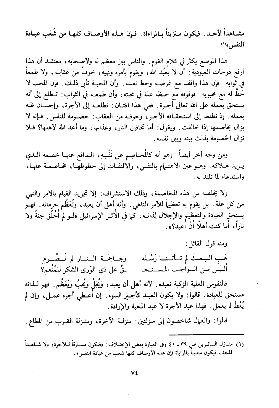 هَذَا الْمَوْضِعُ يَكْثُرُ فِي كَلَامِ الْقَوْمِ. وَالنَّاسُ بَيْنَ مُعَظِّمٍ لَهُ وَلِأَصْحَابِهِ، مُعْتَقِدٍ أَنَّ هَذَا أَرْفَعُ دَرَجَاتِ الْعُبُودِيَّةِ: أَنْ لَا يَعْبُدَ اللَّهَ وَيَقُومَ بِأَمْرِهِ وَنَهْيِهِ خَوْفًا مِنْ عِقَابِهِ، وَلَا طَمَعًا فِي ثَوَابِهِ. فَإِنَّ هَذَا وَاقِفٌ مَعَ غَرَضِهِ وَحَظِّ نَفْسِهِ. وَأَنَّ الْمَحَبَّةَ تَأْبَى ذَلِكَ. فَإِنَّ الْمُحِبَّ لَا حَظَّ لَهُ مَعَ مَحْبُوبِهِ. فَوُقُوفُهُ مَعَ حَظِّهِ عِلَّةٌ فِي مَحَبَّتِهِ، وَأَنَّ طَمَعَهُ فِي الثَّوَابِ تَطَلُّعٌ إِلَى أَنَّهُ يَسْتَحِقُّ بِعَمَلِهِ عَلَى اللَّهِ تَعَالَى أُجْرَةً. فَفِي هَذَا آفَتَانِ: تَطَلُّعُهُ إِلَى الْأُجْرَةِ، وَإِحْسَانُ ظَنِّهِ بِعَمَلِهِ؛ إِذْ تَطَلُّعُهُ إِلَى اسْتِحْقَاقِهِ الْأَجْرَ، وَخَوْفُهُ مِنَ الْعِقَابِ: خُصُومَةٌ لِلنَّفْسِ، فَإِنَّهُ لَا يَزَالُ يُخَاصِمُهَا إِذَا خَالَفَتْ. وَيَقُولُ: أَمَا تَخَافِينَ النَّارَ، وَعَذَابَهَا، وَمَا أَعَدَّ اللَّهُ لِأَهْلِهَا؟ فَلَا تَزَالُ الْخُصُومَةُ بِذَلِكَ بَيْنَهُ وَبَيْنَ نَفْسِهِ.