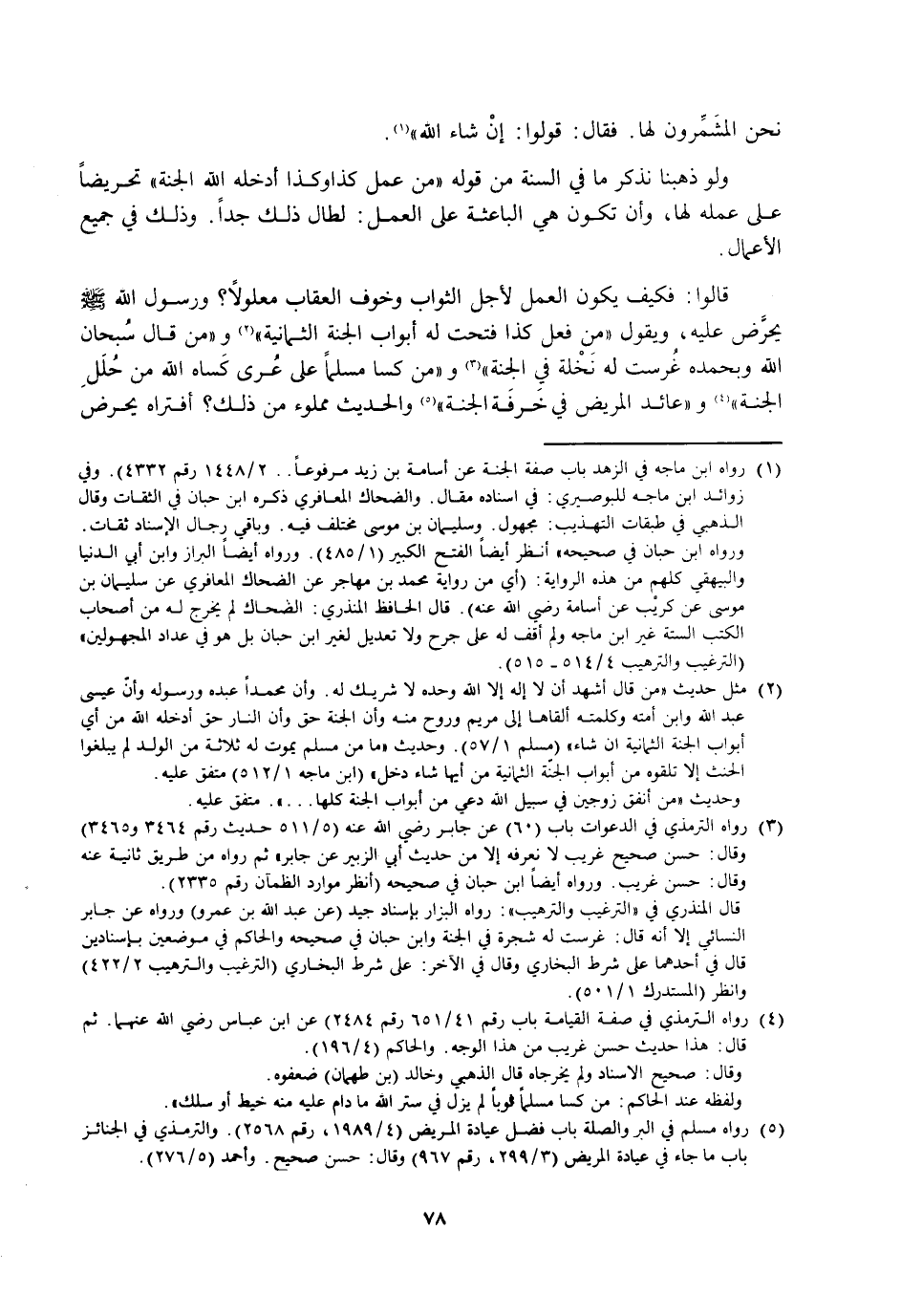 وَلَوْ ذَهَبْنَا نَذْكُرُ مَا فِي السُّنَّةِ مِنْ قَوْلِهِ: 32 مَنْ عَمِلِ كَذَا وَكَذَا أَدْخَلَهُ اللَّهُ الْجَنَّةَ تَحْرِيضًا عَلَى عَمَلِهِ لَهَا، وَأَنْ تَكُونَ هِيَ الْبَاعِثَةُ عَلَى الْعِلْمِ: لَطَالَ ذَلِكَ جِدًّا. وَذَلِكَ فِي جَمِيعِ الْأَعْمَالِ.