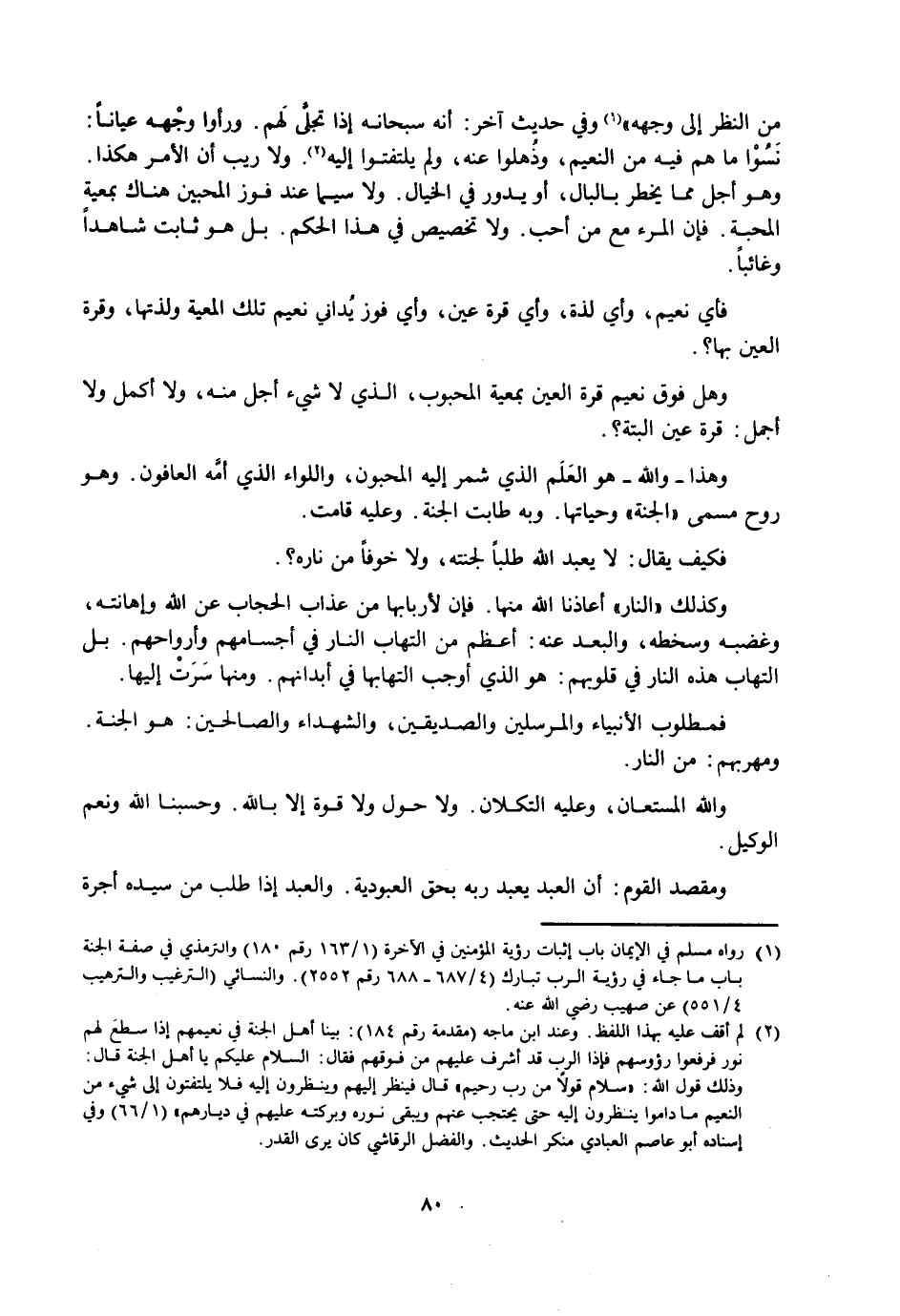 مِنَ النَّظَرِ إِلَى وَجْهِهِ، وَفِي» حَدِيثٍ آخَرَ أَنَّهُ سُبْحَانَهُ «إِذَا تَجَلَّى لَهُمْ، وَرَأَوْا وَجْهَهُ عِيَانًا نَسُوا مَا هُمْ فِيهِ مِنَ النَّعِيمِ، وَذَهَلُوا عَنْهُ، وَلَمْ يَلْتَفِتُوا إِلَيْهِ» . وَلَا رَيْبَ أَنَّ الْأَمْرَ هَكَذَا. وَهُوَ أَجَلُّ مِمَّا يَخْطُرُ بِالْبَالِ، أَوْ يَدُورُ فِي الْخَيَالِ. وَلَا سِيَّمَا عِنْدَ فَوْزِ الْمُحِبِّينَ هُنَاكَ بِمَعِيَّةِ الْمُحِبِّ. فَإِنَّ الْمَرْءَ مَعَ مَنْ أَحَبَّ. وَلَا تَخْصِيصَ فِي هَذَا الْحُكْمِ. بَلْ هُوَ ثَابِتٌ شَاهِدًا وَغَائِبًا.
