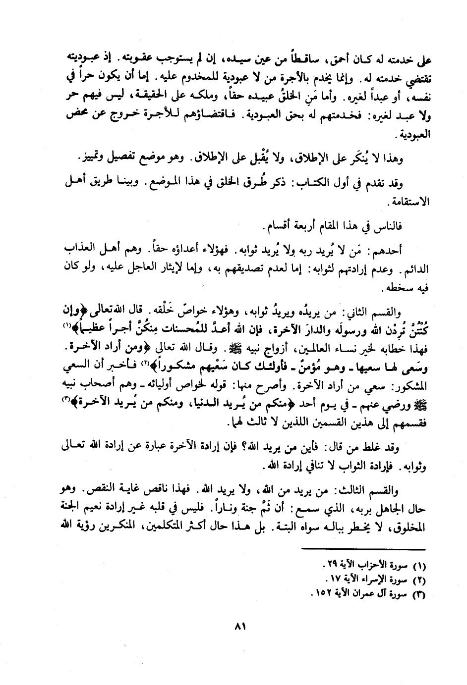 وَالْقِسْمُ الثَّانِي: مَنْ يُرِيدُهُ وَيُرِيدُ ثَوَابَهُ، وَهَؤُلَاءِ خَوَاصُّ خَلْقِهِ. قَالَ اللَّهُ تَعَالَى: {وَإِنْ كُنْتُنَّ تُرِدْنَ اللَّهَ وَرَسُولَهُ وَالدَّارَ الْآخِرَةَ فَإِنَّ اللَّهَ أَعَدَّ لِلْمُحْسِنَاتِ مِنْكُنَّ أَجْرًا عَظِيمًا} [الأحزاب: 29] فَهَذَا خِطَابُهُ لِخَيْرِ نِسَاءِ الْعَالَمِينَ، أَزْوَاجِ نَبِيِّهِ صَلَّى اللَّهُ عَلَيْهِ وَسَلَّمَ. وَقَالَ اللَّهُ تَعَالَى: {وَمَنْ أَرَادَ الْآخِرَةَ وَسَعَى لَهَا سَعْيَهَا وَهُوَ مُؤْمِنٌ فَأُولَئِكَ كَانَ سَعْيُهُمْ مَشْكُورًا} [الإسراء: 19] ، فَأَخْبَرَ أَنَّ السَّعْيَ الْمَشْكُورَ: سَعْيُ مَنْ أَرَادَ الْآخِرَةَ. وَأَصْرَحُ مِنْهَا قَوْلُهُ: لِخَوَاصِّ أَوْلِيَائِهِ - وَهُمْ أَصْحَابُ نَبِيِّهِ صَلَّى اللَّهُ عَلَيْهِ وَسَلَّمَ وَرَضِيَ عَنْهُمْ - فِي يَوْمِ أُحُدٍ: {مِنْكُمْ مَنْ يُرِيدُ الدُّنْيَا وَمِنْكُمْ مَنْ يُرِيدُ الْآخِرَةَ} [آل عمران: 152] فَقَسَمَهُمْ إِلَى هَذَيْنِ الْقِسْمَيْنِ اللَّذَيْنِ لَا ثَالِثَ لَهُمَا.