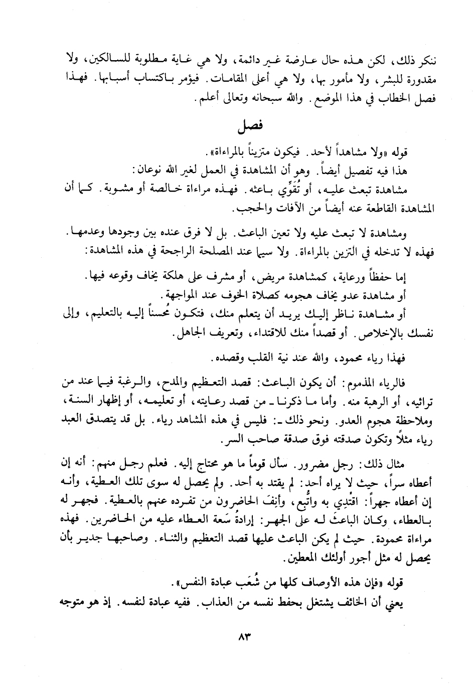 وَمُشَاهَدَةٌ لَا تَبْعَثُ عَلَيْهِ وَلَا تُعِينُ الْبَاعِثَ. بَلْ لَا فَرْقَ عِنْدَهُ بَيْنَ وُجُودِهَا وَعَدَمِهَا. فَهَذِهِ لَا تُدْخِلُهُ فِي التَّزَيُّنِ بِالْمُرَاءَاةِ. وَلَا سِيَّمَا عِنْدَ الْمَصْلَحَةِ الرَّاجِحَةِ فِي هَذِهِ الْمُشَاهَدَةِ: