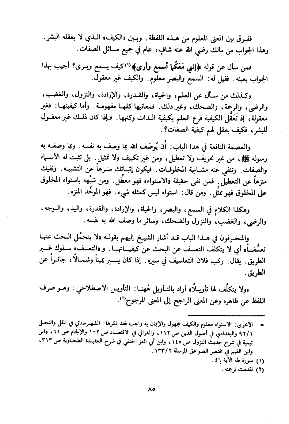 وَالْعِصْمَةُ النَّافِعَةُ فِي هَذَا الْبَابِ: أَنْ يُوصَفَ اللَّهُ بِمَا وَصَفَ بِهِ نَفْسَهُ. وَبِمَا وَصَفَهُ بِهِ رَسُولُهُ صَلَّى اللَّهُ عَلَيْهِ وَسَلَّمَ، مِنْ غَيْرِ تَحْرِيفٍ وَلَا تَعْطِيلٍ، وَمِنْ غَيْرِ تَكْيِيفٍ وَلَا تَمْثِيلٍ. بَلْ تُثْبَتُ لَهُ الْأَسْمَاءُ وَالصِّفَاتُ، وَتُنْفَى عَنْهُ مُشَابَهَةُ الْمَخْلُوقَاتِ. فَيَكُونُ إِثْبَاتُكَ مُنَزَّهًا عَنِ التَّشْبِيهِ. وَنَفْيُكَ مُنَزَّهًا عَنِ التَّعْطِيلِ. فَمَنْ نَفَى حَقِيقَةَ الِاسْتِوَاءِ فَهُوَ مُعَطِّلٌ. وَمَنْ شَبَّهَهُ بِاسْتِوَاءِ الْمَخْلُوقِ عَلَى الْمَخْلُوقِ فَهُوَ مُمَثِّلٌ. وَمَنْ قَالَ: اسْتِوَاءٌ لَيْسَ كَمِثْلِهِ شَيْءٌ. فَهُوَ الْمُوَحِّدُ الْمُنَزِّهُ.