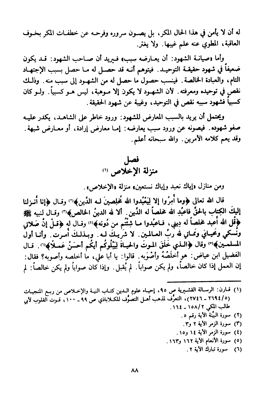 وَمِنْ مَنَازِلِ: {إِيَّاكَ نَعْبُدُ وَإِيَّاكَ نَسْتَعِينُ} [الفاتحة: 5] مَنْزِلَةُ الْإِخْلَاصِ