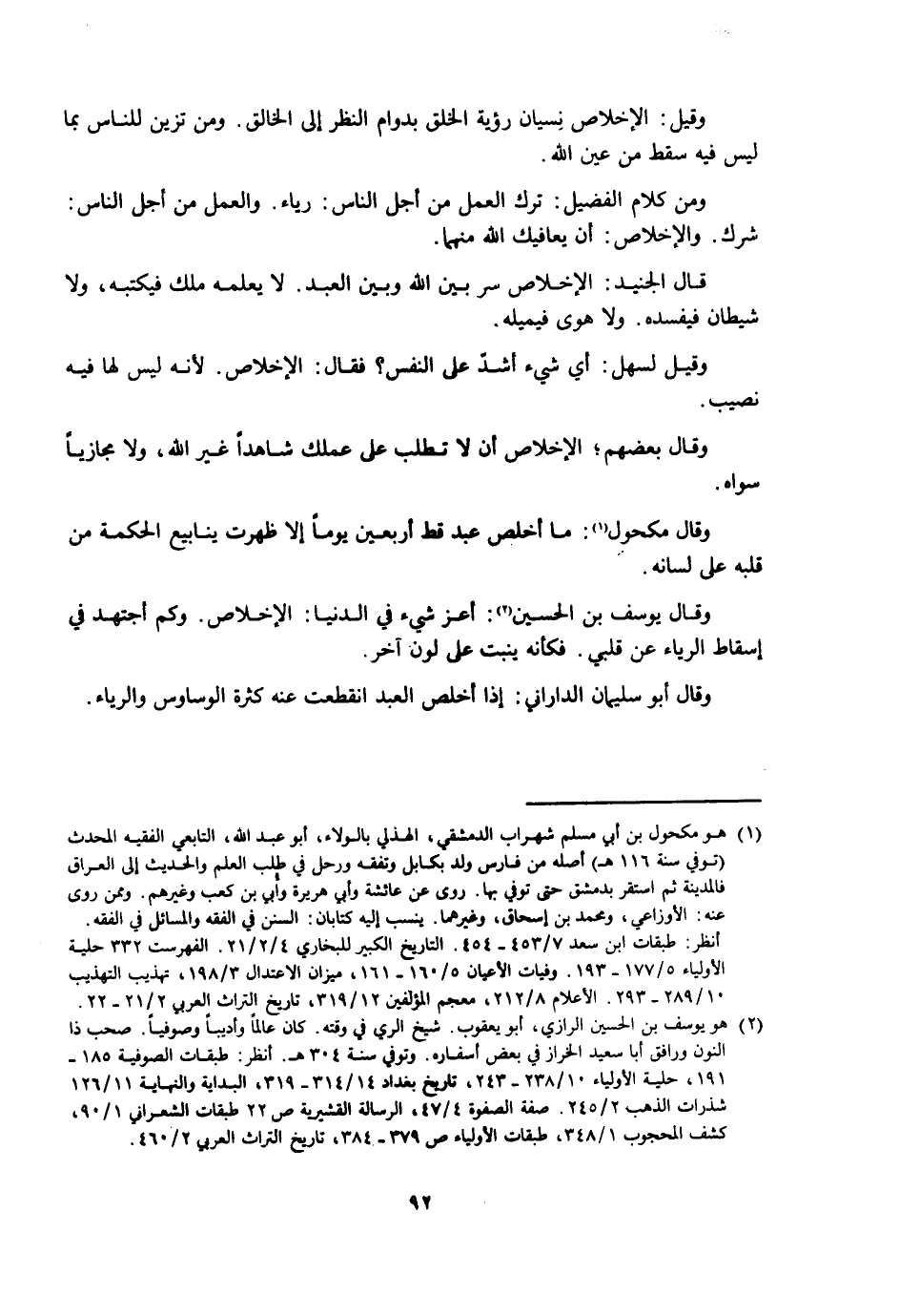 وَقَالَ أَبُو سُلَيْمَانَ الدَّارَانِيُّ: إِذَا أَخْلَصَ الْعَبْدُ انْقَطَعَتْ عَنْهُ كَثْرَةُ الْوَسَاوِسِ وَالرِّيَاءِ.