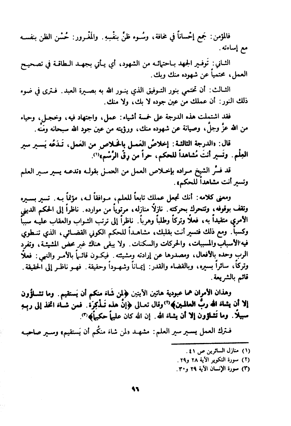 قَالَ: الدَّرَجَةُ الثَّالِثَةُ: إِخْلَاصُ الْعَمَلِ بِالْخَلَاصِ مِنَ الْعَمَلِ، تَدَعُهُ يَسِيرُ سَيْرَ الْعِلْمِ. وَتَسِيرُ أَنْتَ مُشَاهِدًا لِلْحُكْمِ، حُرًّا مِنْ رِقِّ الرَّسْمِ.
