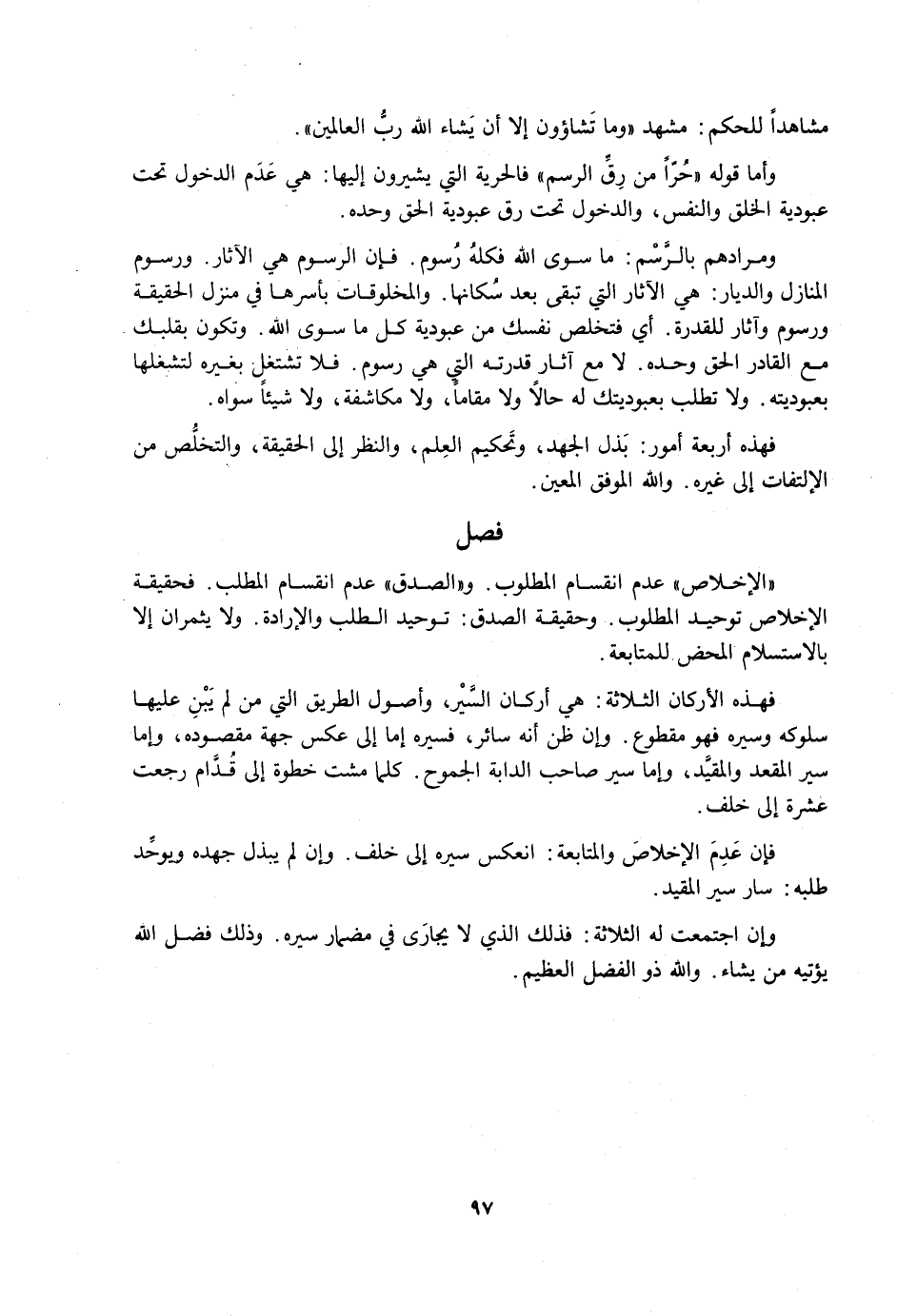 وَمُرَادُهُمْ بِالرَّسْمِ: مَا سِوَى اللَّهِ، فَكُلُّهُ رُسُومٌ. فَإِنَّ الرُّسُومَ هِيَ الْآثَارُ. وَرُسُومُ الْمَنَازِلِ وَالدِّيَارِ: هِيَ الْآثَارُ الَّتِي تَبْقَى بَعْدَ سُكَّانِهَا. وَالْمَخْلُوقَاتُ بِأَسْرِهَا فِي مَنْزِلِ الْحَقِيقَةِ رُسُومٌ وَآثَارٌ لِلْقُدْرَةِ؛ أَيْ فَتُخَلِّصُ نَفْسَكَ مِنْ عُبُودِيَّةِ كُلِّ مَا سِوَى اللَّهِ، وَتَكُونُ بِقَلْبِكَ مَعَ الْقَادِرِ الْحَقِّ وَحْدَهُ. لَا مَعَ آثَارِ قُدْرَتِهِ الَّتِي هِيَ رُسُومٌ. فَلَا تَشْتَغِلُ بِغَيْرِهِ لِتَشْغَلَهَا بِعُبُودِيَّتِهِ. وَلَا تَطْلُبُ بِعُبُودِيَّتِكَ لَهُ حَالًا وَلَا مَقَامًا. وَلَا مُكَاشَفَةً، وَلَا شَيْئًا سِوَاهُ.