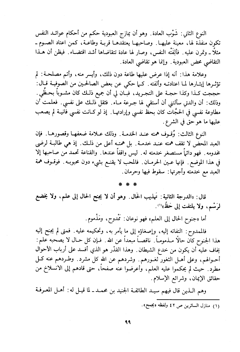 فَالْمَمْدُوحُ: الْتِفَاتُهُ إِلَيْهِ، وَإِصْغَاؤُهُ إِلَى مَا يَأْمُرُ بِهِ، وَتَحْكِيمُهُ عَلَيْهِ، فَمَتَى لَمْ يَجْنَحْ إِلَيْهِ هَذَا الْجُنُوحَ كَانَ حَالًا مَذْمُومًا. نَاقِصًا مُبْعَدًا عَنِ اللَّهِ. فَإِنَّ كُلَّ حَالٍ لَا يَصْحَبُهُ عِلْمٌ يَخَافُ عَلَيْهِ أَنْ يَكُونَ مِنْ خُدَعِ الشَّيْطَانِ. وَهَذَا الْقَدْرُ هُوَ الَّذِي أَفْسَدَ عَلَى أَرْبَابِ الْأَحْوَالِ أَحْوَالَهُمْ، وَعَلَى أَهْلِ الثُّغُورِ ثُغُورَهُمْ، وَشَرَّدَهُمْ عَنِ اللَّهِ كُلَّ مُشَرَّدٍ، وَطَرَدَهُمْ عَنْهُ كُلَّ مَطْرَدٍ؛ حَيْثُ لَمْ يُحَكِّمُوا عَلَيْهِ الْعِلْمَ، وَأَعْرَضُوا عَنْهُ صَفْحًا، حَتَّى قَادَهُمْ إِلَى الِانْسِلَاخِ مِنْ حَقَائِقِ الْإِيمَانِ، وَشَرَائِعِ الْإِسْلَامِ.