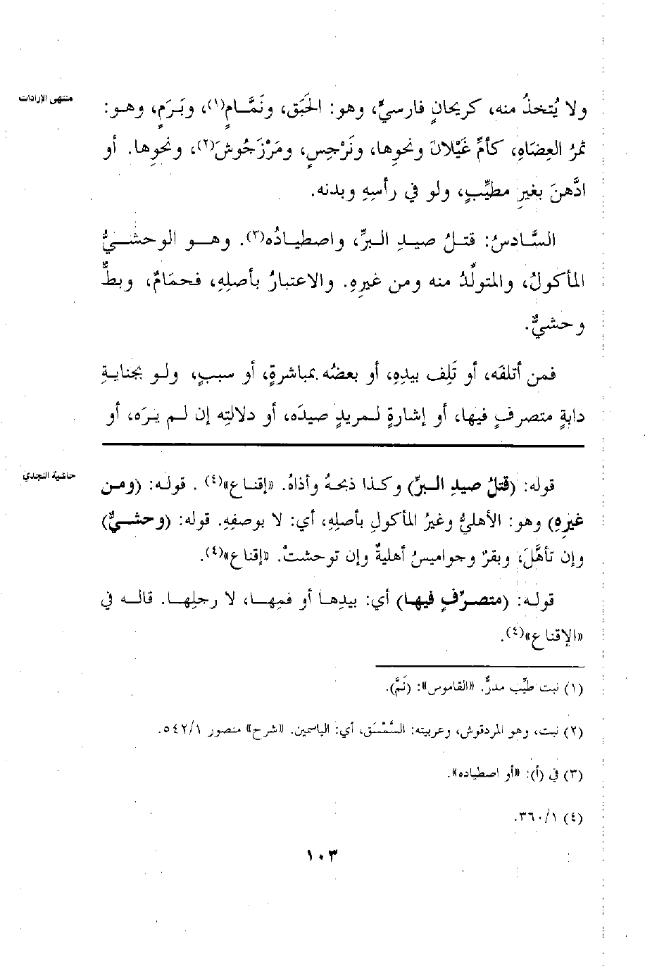 وَلَا يُتَّخَذُ مِنْهُ كَرَيْحَانٍ فَارِسِيٍّ وَهُوَ الْحَبَقُ وَكَنَمَّامٍ وَبَرَمٍ وَهُوَ ثَمَرُ الْعُصَاةِ كَأُمِّ غِيلَانَ وَنَحْوِهَا، وَكَنَرْجِسِ وَكَمَرْزَنْجُوشَ وَنَحْوِهَا أَوْ ادَّهَنَ بغَيْرِ مُطَيِّبٍ وَلَوْ فِي رَأْسِهِ أَوْ بَدَنِهِ السَّادِسُ: قَتْلُ صَيْدِ الْبَرِّ وَاصْطِيَادُهُ وَهُوَ الْوَحْشِيُّ الْمَأْكُولُ وَالْمُتَوَلِّدُ مِنْهُ وَمِنْ غَيْرِهِ وَالِاعْتِبَارُ بِأَصْلِهِ فَحَمَامٌ وَبَطٌّ وَحْشِيٌّ فَمَنْ أَتْلَفَهُ أَوْ تَلِفَ بِيَدِهِ أَوْ بَعْضُهُ بِمُبَاشَرَةِ إتْلَافِهِ أَوْ سَبَبٍ وَلَوْ بِجِنَايَةِ دَابَّةِ مُحْرِمٍ مُتَصَرِّفٍ فِيهَا أَوْ بِإِشَارَةِ مُحْرِمٍ لِمُرِيدِ صَيْدٍ أَوْ دَلَالَتُهُ أَنْ لَمْ يَرَهُ أَوْ