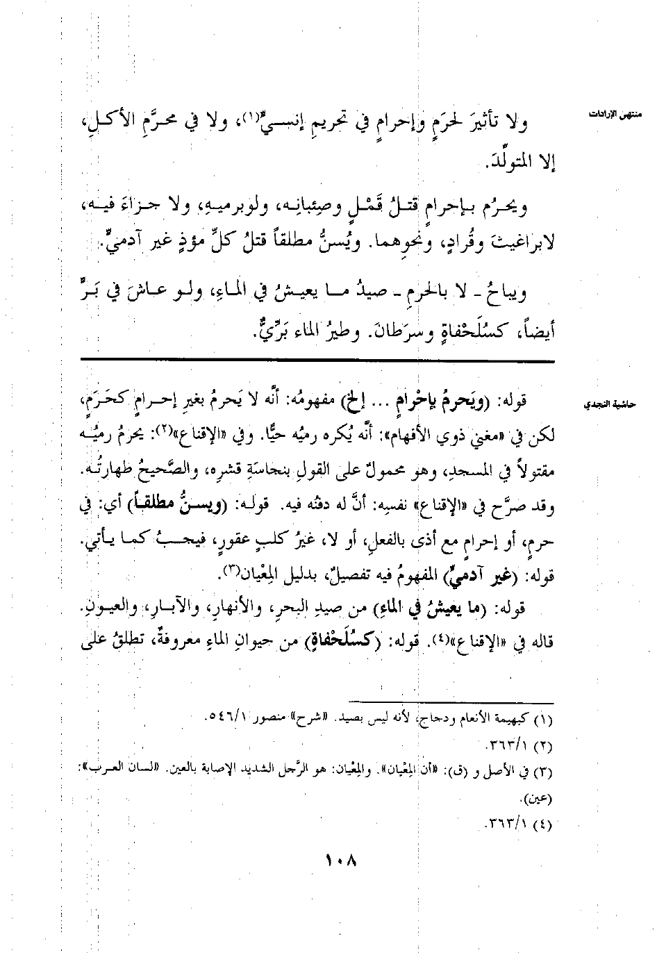 وَلَا تَأْثِيرَ لِحَرَمٍ وإحْرَامٍ فِي تَحْرِيمِ إنْسِيٍّ وَلَا فِي مُحَرَّمِ الْأَكْلِ إلَّا الْمُتَوَلِّدَ وَيَحْرُمُ بِإِحْرَامٍ قَتْلُ قَمْلٍ وَصِئْبَانِهِ وَلَوْ بِرَمْيِهِ وَلَا جَزَاءَ فِيهِ لَا بَرَاغِيثَ وَقُرَادٍ وَنَحْوِهِمَا وَيُسَنُّ مُطْلَقًا قَتْلُ كُلِّ مُؤْذٍ غَيْرِ آدَمِيٍّ وَيُبَاحُ لَا بِالْحَرَمِ: صَيْدُ مَا يَعِيشُ فِي الْمَاءِ كَسَمَكٍ، وَلَوْ عَاشَ فِي بَرٍّ أَيْضًا، كَسُلَحْفَاةٍ وَسَرَطَانٍ وَطَيْرُ الْمَاءِ بَرِّيٌّ