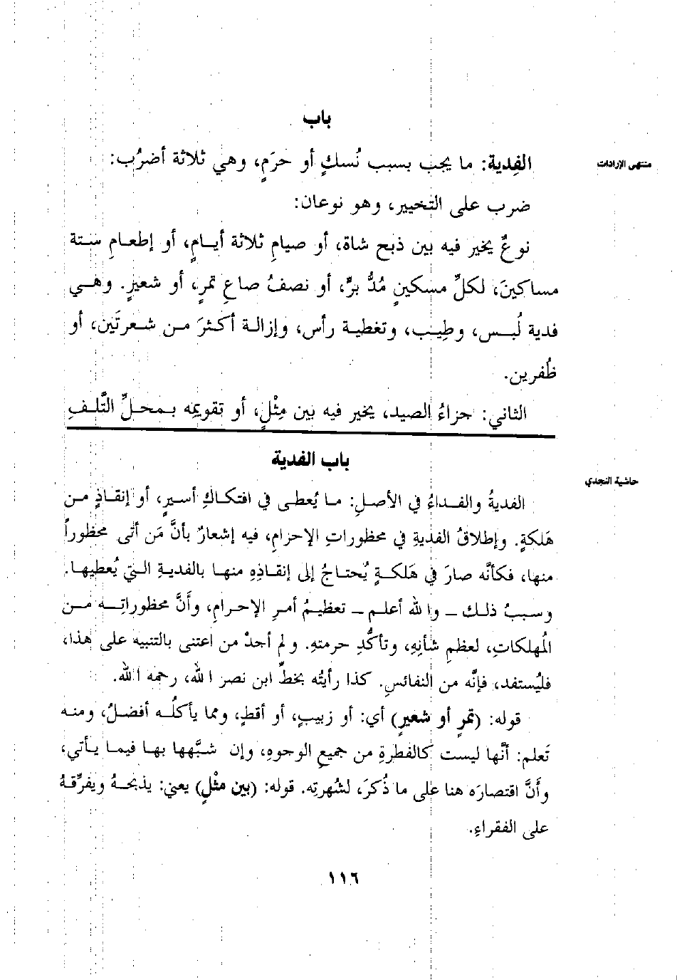 الفدية: مَا يَجِبُ بِسَبَبِ نُسُكٍ أَوْ حَرَمٍ وَهِيَ ثَلَاثَةُ أَضْرُبٍ ضَرْبٌ عَلَى التَّخْيِيرِ وَهُوَ نَوْعَانِ نَوْعٌ يُخَيَّرُ فِيهِ بَيْنَ ذَبْحِ شَاةٍ، أَوْ صِيَامِ ثَلَاثَةِ أَيَّامٍ أَوْ إطْعَامِ سِتَّةِ مَسَاكِينَ لِكُلِّ مِسْكِينٍ مُدُّ بُرٍّ، أَوْ نِصْفُ صَاعِ تَمْرٍ، أَوْ شَعِيرٍ وَهِيَ فِدْيَةُ لُبْسِ مَخِيطٍ وَطِيبٍ وَتَغْطِيَةِ رَأْسِ وَإِزَالَةِ أَكْثَرَ مِنْ شَعْرَتَيْنِ أَوْ أَكْثَرَ مِنْ ظُفْرَيْنِ أَوْ الثَّانِي جَزَاءُ الصَّيْدِ يُخَيَّرُ فِيهِ بَيْنَ مِثْلِ أَوْ تَقْوِيمُهُ بِمَحِلِّ التَّلَفِ لِلصَّيْدِ