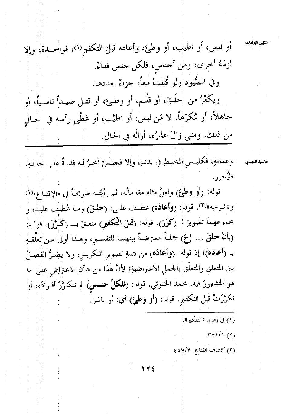 أَوْ لَبِسَ أَوْ تَطَيَّبَ أَوْ وَطِئَ وَأَعَادَهُ قَبْلَ التَّكْفِيرِ فوَاحِدَةٌ وَإِلَّا لَزِمَهُ أُخْرَى ومِنْ أَجْنَاسٍ فلِكُلِّ جِنْسٍ فِدَاءٌ وفِي الصُّيُودِ وَلَوْ قُتِلَتْ مَعًا جَزَاءٌ بِعَدَدِهَا وَيُكَفِّرُ مَنْ حَلَقَ أَوْ قَلَّمَ أَوْ وَطِئَ أَوْ قَتَلَ صَيْدًا نَاسِيًا أَوْ جَاهِلًا أَوْ مُكْرَهًا لَا مَنْ لَبِسَ أَوْ تَطَيَّبَ أَوْ غَطَّى رَأْسَهُ فِي حَالٍ مِنْ ذَلِكَ وَمَتَى زَالَ عُذْرُهُ أَزَالَهُ فِي الْحَالِ