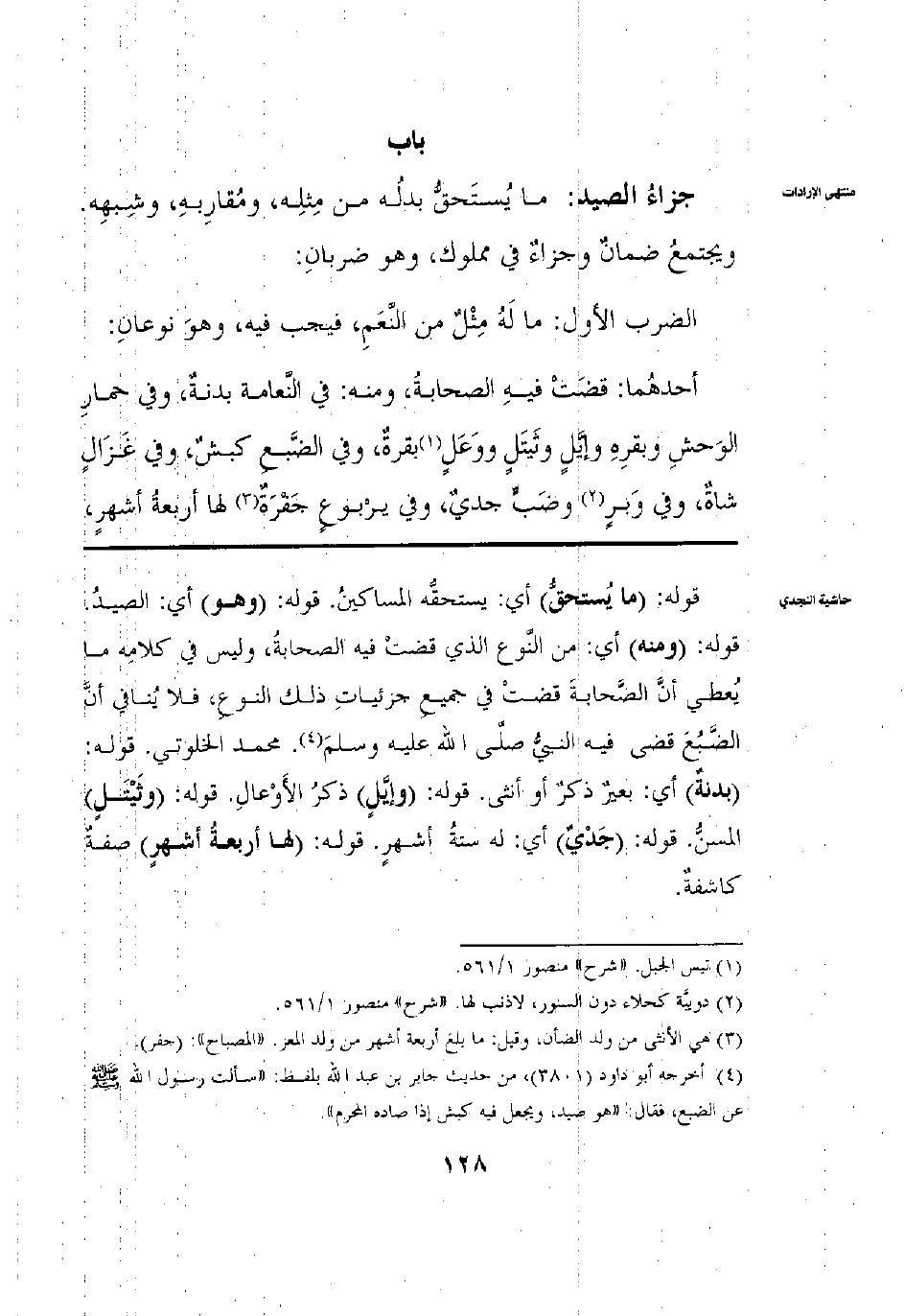 جزاء الصيد: مَا يُسْتَحَقُّ بَدَلُهُ مِنْ مِثْلِهِ وَمُقَارِبِهِ وَشِبْهِهِ وَيَجْتَمِعُ ضَمَانُ وَجَزَاءٌ فِي مَمْلُوكٍ وَهُوَ ضَرْبَانِ مَا لَهُ مِثْلٌ مِنْ النَّعَمِ فَيَجِبُ فِيهِ نَصًّا وَهُوَ نَوْعَانِ أَحَدُهُمَا: مَا قَضَتْ فِيهِ الصَّحَابَةُ وَمِنْهُ فِي النَّعَامَةِ بَدَنَةٌ وَفِي حِمَارِ الْوَحْشِ وبَقَرِهِ وأُيَّلٍ وَثيتل ووَعِلٍ بَقَرَةٌ وَفِي الضَّبُعِ كَبْشٌ وَفِي غَزَالٍ شَاةٌ رُوِيَ عَنْ عَلِيٍّ وَابْنِ عُمَرَ وَرَوَى جَابِرٌ مَرْفُوعًا «فِي الظَّبْيِ شَاةٌ» قَالَهُ فِي شَرْحِهِ. وَفِي الْمُبْدِعِ: قَضَى بِهِ عُمَرُ وَابْنُ وَرُوِيَ عَنْ عَلِيٍّ وَفِي وَبْرٍ وضَبٍّ: جَدْيٌ وَفِي يَرْبُوعٍ: جَفْرَةٌ لَهَا أَرْبَعَةُ أَشْهُرٍ