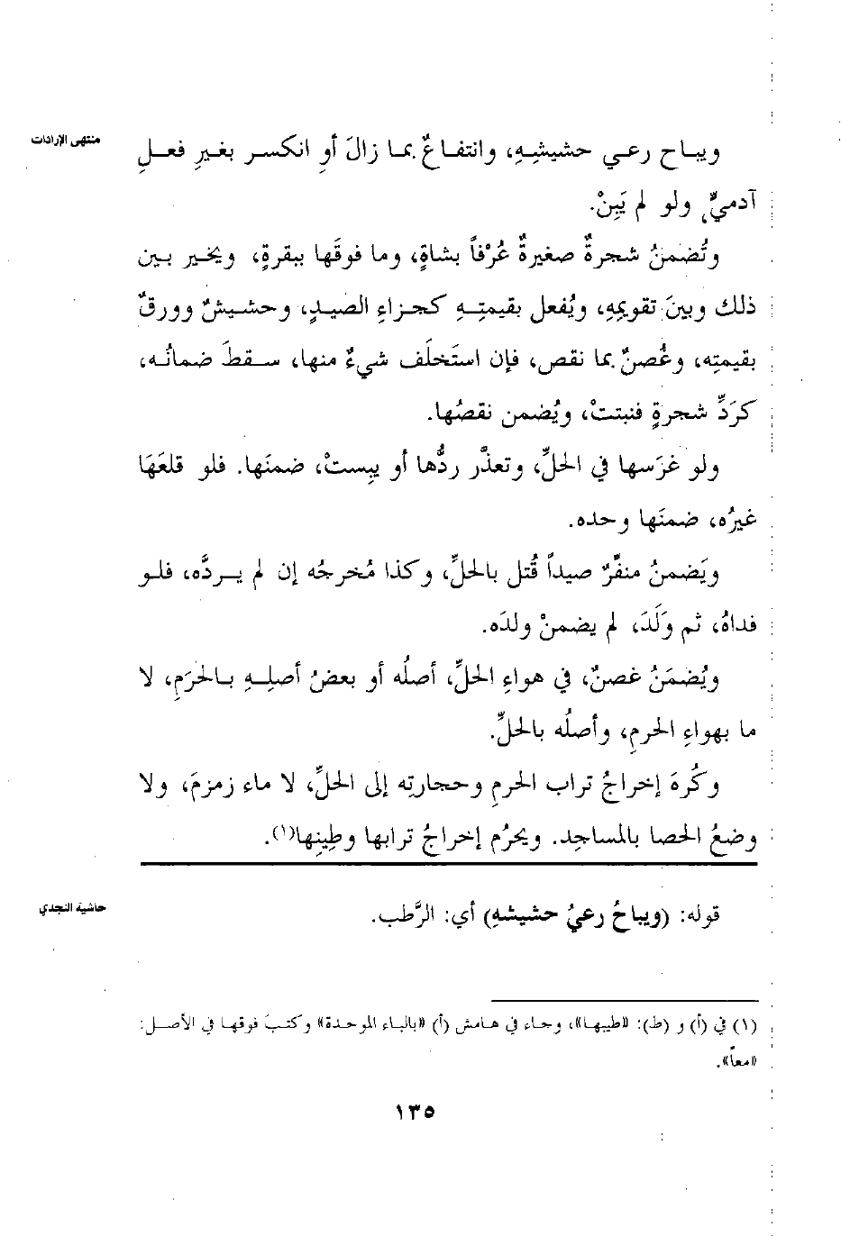 وَيُبَاحُ رَعْيُ حَشِيشَةِ وانْتِفَاعٌ بِمَا زَالَ أَوْ انْكَسَرَ مِنْهُ بِغَيْرِ فِعْلِ آدَمِيٍّ وَلَوْ لَمْ يَبِنْ وَتُضْمَنُ شَجَرَةٌ صَغِيرَةً عُرْفًا بِشَاةٍ ومَا فَوْقَهَا بِبَقَرَةٍ وَيُخَيَّرُ بَيْنَ ذَلِكَ وَبَيْنَ تَقْوِيمِهِ وَيَفْعَلُ بِقِيمَتِهِ كَجَزَاءِ الصَّيْدِ وحَشِيشٌ وَوَرَقٌ بِقِيمَتِهِ وغُصْنٌ بِمَا نَقَصَ فَإِنْ اسْتَخْلَفَ شَيْءٌ مِنْهَا سَقَطَ ضَمَانُهُ كَرَدِّ شَجَرَةٍ فَتَنْبُتُ وَيُضْمَنُ نَقْصُهَا وَلَوْ غَرَسَهَا فِي الْحِلِّ وَتَعَذَّرَ رَدُّهَا أَوْ يَبِسَتْ ضَمِنَهَا فَلَوْ قَلَعَهَا غَيْرُهُ ضَمِنَهَا وَحْدَهُ وَيَضْمَنُ مُنَفِّرٌ صَيْدًا قُتِلَ بِالْحِلِّ وَكَذَا مُخْرِجُهُ إنْ لَمْ يَرُدَّهُ فَلَوْ فَدَاهُ ثُمَّ وَلَدَ لَمْ يَضْمَنْ وَلَدَهُ وَيُضْمَنُ غُصْنٌ أَصْلُهُ أَوْ بَعْضُ أَصْلِهِ بِالْحَرَمِ لَا مَا بِهَوَاءِ الْحَرَمِ وَأَصْلُهُ بِالْحِلِّ وَكُرِهَ إخْرَاجُ تُرَابِ الْحَرَمِ وَإِخْرَاجُ حِجَارَتِهِ إلَى الْحِلِّ لَا مَاءِ زَمْزَمَ وَلَا وَضْعُ الْحَصَا بِالْمَسَاجِدِ وَيَحْرُمُ إخْرَاجُ تُرَابِهَا وطِينِهَا