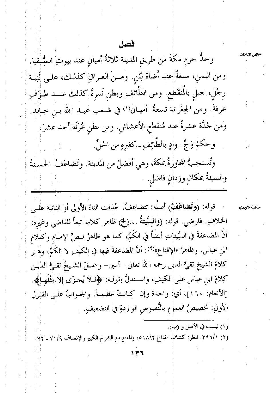 وحد حرم مكة مِنْ طَرِيقِ الْمَدِينَةِ: ثَلَاثَةُ أَمْيَالٍ عِنْدَ بُيُوتِ السُّقْيَا ومِنْ الْيَمَنِ: سَبْعَةُ عِنْدَ أَضَاةِ لِبْنٍ ومِنْ الْعِرَاقِ كَذَلِكَ عَلَى ثَنِيَّةِ رِجْلٍ جَبَلٌ ومِنْ الطَّائِفِ وَبَطْنِ نَمِرَةَ كَذَلِكَ عَنْهُ طَرَفُ عَرَفَةَ ومِنْ الْجِعْرَانَةِ تِسْعَةُ شِعْبِ عَبْدِ اللَّهِ بْنِ خَالِدٍ مِنْ طَرِيقِ جُدَّةَ: عَشَرَةُ عِنْدَ مُنْقَطِعِ الْأَعْشَاشِ ومِنْ بَطْنِ عُرَنَةَ: أَحَدَ عَشَرَ مِيلًا وَحُكْمُ وَجٍ وَهُوَ وَادٍ بِالطَّائِفِ: كَغَيْرِهِ مِنْ الْحِلِّ وَتُسْتَحَبُّ الْمُجَاوَرَةُ بِمَكَّةَ وَهِيَ أَفْضَلُ مِنْ الْمَدِينَةِ وَتُضَاعَفُ السَّيْئَةُ وَالْحَسَنَةُ بِمَكَانٍ وَزَمَانٍ فَاضِلٍ