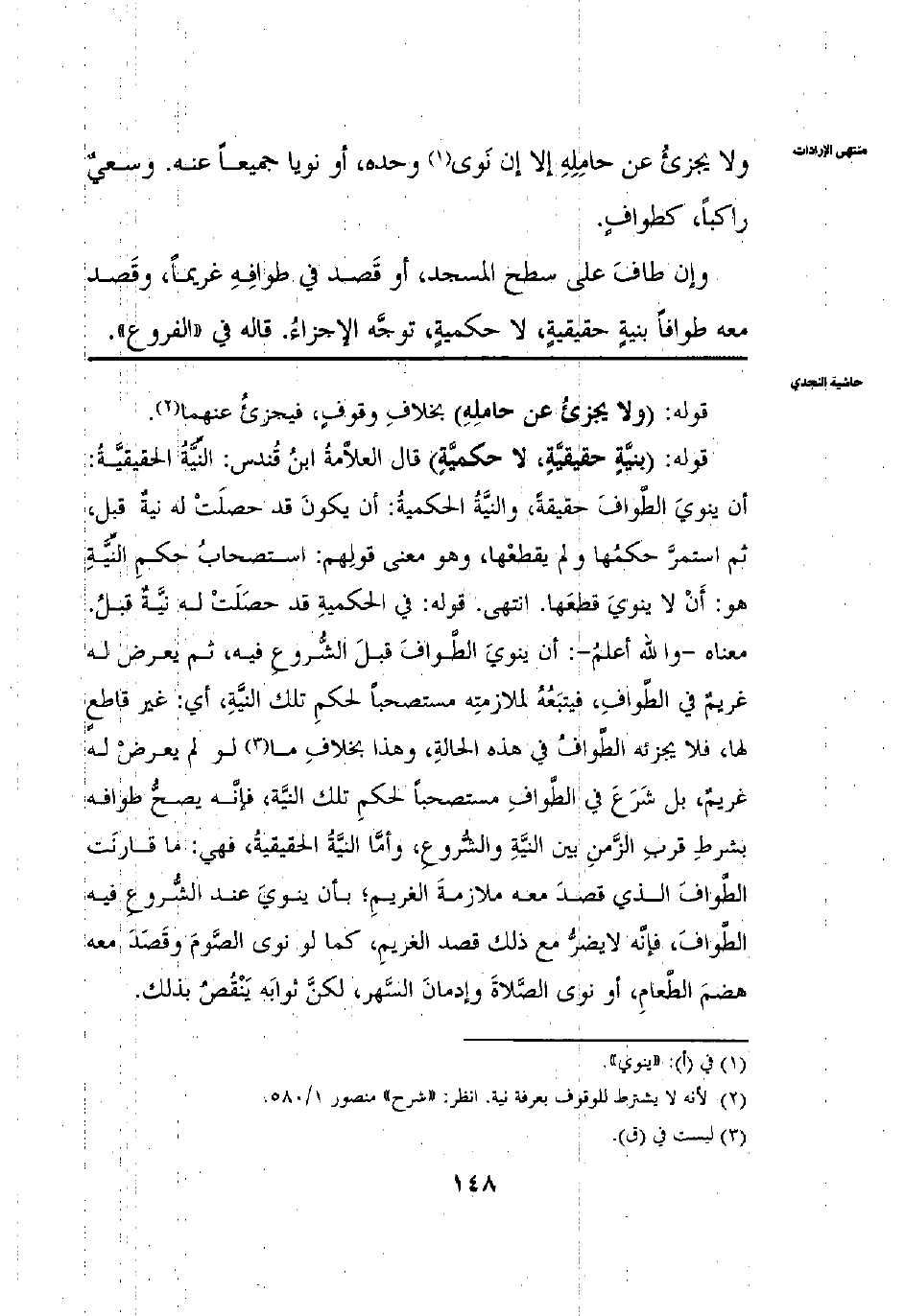 وَلَا يُجْزِئُ عَنْ حَامِلِهِ إلَّا إنْ نَوَى وَحْدَهُ أَوْ نَوَيَا جَمِيعًا عَنْهُ ورَاكِبًا كَطَوَافٍ وَإِنْ طَافَ عَلَى سَطْحِ الْمَسْجِدِ أَوْ قَصَدَ فِي طَوَافِهِ غَرِيمًا وَقَصَدَ مَعَهُ طَوَافًا بِنِيَّةٍ حَقِيقِيَّةٍ لَا حُكْمِيَّةٍ تَوَجَّهَ الْإِجْزَاءُ قَالَهُ فِي الْفُرُوعِ