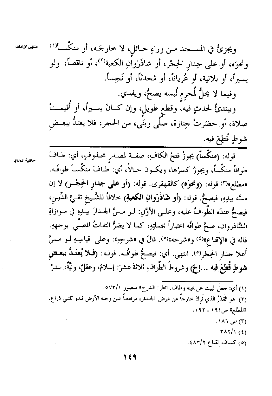 وَيُجْزِئُ فِي الْمَسْجِدِ مِنْ وَرَاءِ حَائِلٍ لَا خَارِجَهُ أَوْ مُنَكِّسًا وَنَحْوَهُ أَوْ عَلَى جِدَارِ الْحِجْرِ أَوْ شَاذَرْوَانَ الْكَعْبَةِ أَوْ نَاقِصًا، وَلَوْ يَسِيرًا أَوْ بِلَا نِيَّةٍ أَوْ عُرْيَانًا أَوْ مُحْدِثًا أَوْ نَجِسًا وفِيمَا لَا يَحِلُّ لِمُحْرِمٍ لُبْسُهُ يَصِحُّ طَوَافُهُ وَيَفْدِي وَيَبْتَدِئُ الطَّوَافَ لِحَدَثٍ فِيهِ وَيَبْتَدِئُهُ لِقَطْعٍ طَوِيلٍ وَإِنْ كَانَ قَطَعَهُ يَسِيرًا أَوْ أُقِيمَتْ صَلَاةٌ أَوْ حَضَرَتْ جِنَازَةٌ وَهُوَ فِيهِ صَلَّى وَبَنَى مِنْ الْحَجَرِ فَلَا يَعْتَدُّ بِبَعْضِ شَوْطٍ قَطَعَ فِيهِ