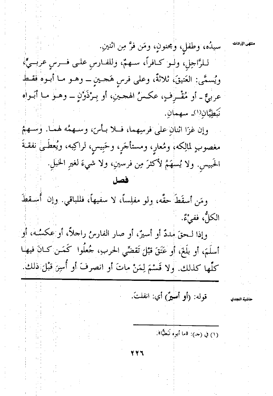 لِلرَّاجِلِ وَلَوْ كَافِرًا سَهْمٌ. وَلِلْفَارِسِ عَلَى فَرَسٍ عَرَبِيٍّ وَيُسَمَّى الْعَتِيقُ ثَلَاثَةُ وعَلَى فَرَسٍ هَجِينٍ وَهُوَ مَا أَبُوهُ فَقَطْ عَرَبِيٌّ، أَوْ مُقْرِفٍ عَكْسِ الْهَجِينِ أَوْ بِرْذَوْنٍ وَهُوَ مَا أَبَوَاهُ نَبَطِيَّانِ سَهْمَانِ وَإِنْ غَزَا اثْنَانِ عَلَى فَرَسِهِمَا فَلَا بَأْسَ بِهِ. وَسَهْمُهُ لَهُمَا وَسَهْمُ مَغْصُوبٍ لِمَالِكِهِ ومُعَارٍ وَمُسْتَأْجَرٍ وَحَبِيسٍ لِرَاكِبِهِ وَيُعْطِي نَفَقَةَ الْحَبِيسِ وَلَا يُسْهِمُ لِأَكْثَرِ مِنْ فَرَسَيْنِ وَلَا شَيْءَ لِغَيْرِ الْخَيْلِ