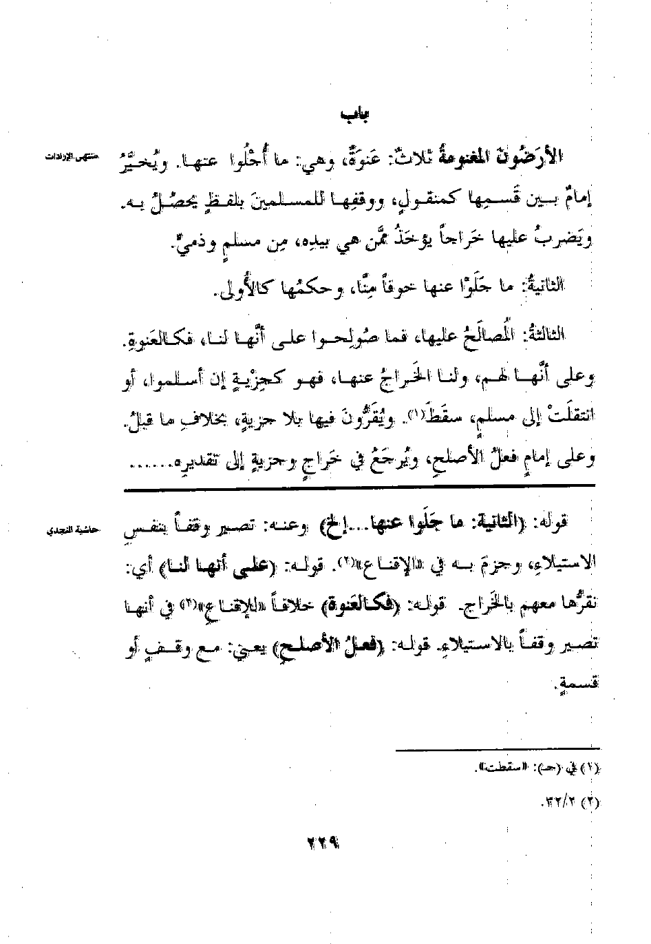 الأرضون المغنومة ثَلَاثُ: عَنْوَةٌ وَهِيَ مَا أُجْلُوا عَنْهَا بِالسَّيْفِ وَيُخَيَّرُ إمَامٌ بَيْنَ قَسْمِهَا كَمَنْقُولٍ ووَقْفِهَا لِلْمُسْلِمِينَ بِلَفْظٍ يَحْصُلُ بِهِ وَيَضْرِبُ عَلَيْهَا خَرَاجًا يُؤْخَذُ مِمَّنْ هِيَ بِيَدِهِ مِنْ مُسْلِمٍ وَذِمِّيٍّ