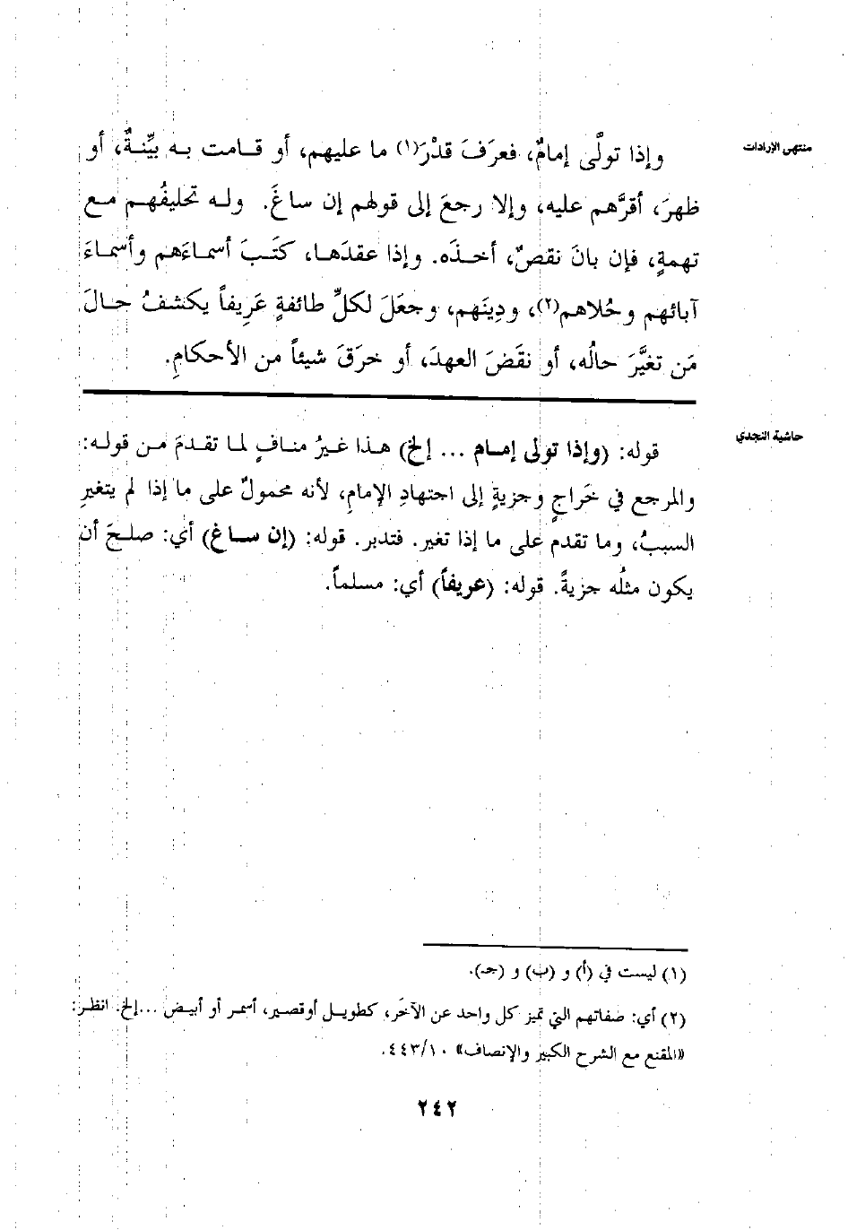 وَإِذَا تَوَلَّى إمَامٌ فَعَرَفَ قَدْرَ مَا عَلَيْهِمْ أَوْ قَامَتْ بِهِ بَيِّنَةٌ أَوْ ظَهَرَ أَقَرَّهُمْ عَلَيْهِ وَإِلَّا رَجَعَ إلَى قَوْلِهِمْ إنْ سَاغَ وَلَهُ تَحْلِيفُهُمْ مَعَ تُهْمَةٍ نَقْصٌ أَخْذُهُ وَإِذَا عَقَدَهَا كَتَبَ أَسْمَاءَهُمْ وَأَسْمَاءَ آبَائِهِمْ وَحِلَاهُمْ ودِينَهُمْ وَجَعَلَ لِكُلِّ طَائِفَةٍ عَرِيفًا يَكْشِفُ حَالَ مَنْ تَغَيَّرَ حَالُهُ أَوْ نَقَضَ الْعَهْدَ أَوْ خَرَقَ شَيْئًا مِنْ الْأَحْكَامِ