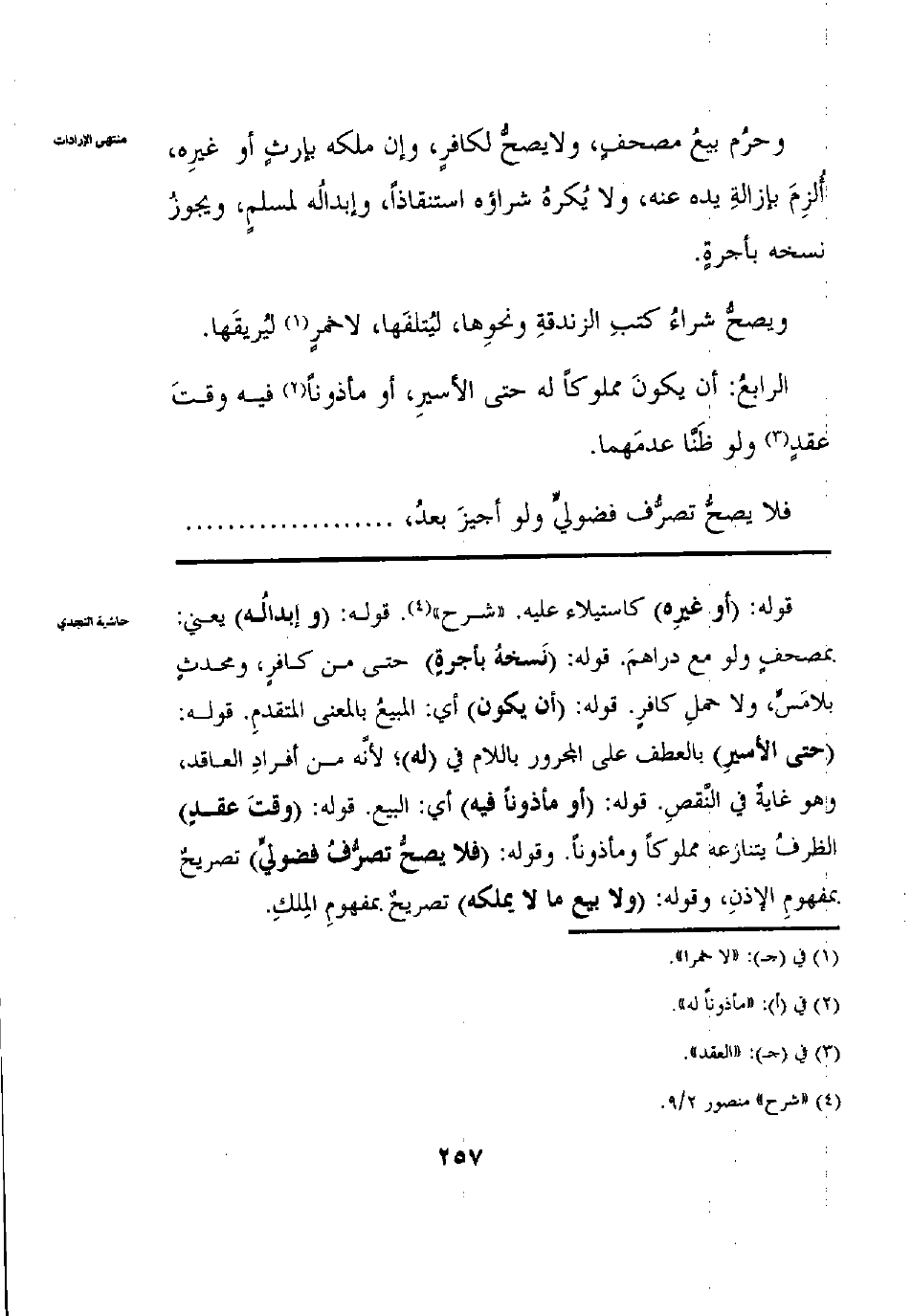 وَحَرُمَ بَيْعُ مُصْحَفٍ وَلَا يَصِحُّ لِكَافِرٍ وَإِنْ مَلَكَهُ بِإِرْثٍ أَوْ غَيْرِهِ أُلْزِمَ بِإِزَالَةِ يَدِهِ عَنْهُ وَلَا يُكْرَهُ شِرَاؤُهُ اسْتِنْقَاذًا وإبْدَالُهُ لِمُسْلِمٍ وَيَجُوزُ نَسْخُهُ بِأُجْرَةٍ وَيَصِحُّ شِرَاءُ كُتُبِ الزَّنْدَقَةِ وَنَحْوهَا لِيُتْلِفَهَا لَا خَمْرٍ لِيُرِيقَهَا الرَّابِعُ: أَنْ يَكُونَ مَمْلُوكًا لَهُ حَتَّى الْأَسِيرَ أَوْ مَأْذُونًا لَهُ فِيهِ وَقْتَ عَقْدِ وَلَوْ ظَنَّا عَدَمَهُمَا فَلَا يَصِحُّ تَصَرُّفُ فُضُولِيٍّ وَلَوْ أُجِيزَ بَعْدَ