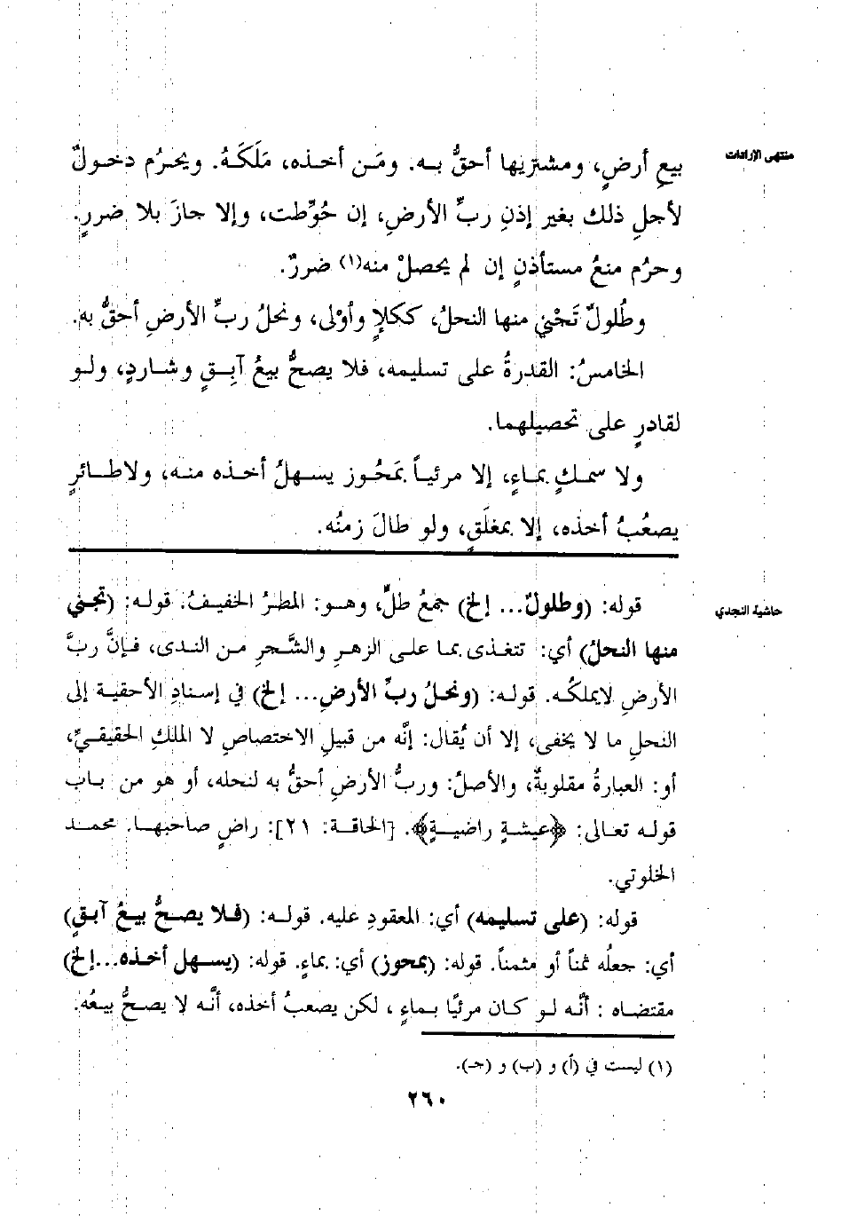 بَيْعِ أَرْضٍ وَمُشْتَرِيهَا أَحَقُّ بِهِ وَمَنْ أَخَذَهُ مَلَكَهُ وَيَحْرُمُ دُخُولٌ لِأَجْلِ ذَلِكَ بِغَيْرِ إذْنِ رَبِّ الْأَرْضِ إنْ حُوِّطَتْ وَإِلَّا جَازَ بِلَا ضَرَرٍ وَحَرُمَ مَنْعُ مُسْتَأْذِنٍ إنْ لَمْ يَحْصُلْ ضَرَرٌ وَطُلُولٌ تُجْنَى مِنْهُ النَّحْلُ كَكَلَإٍ وَأَوْلَى وَنَخْلُ رَبِّ الْأَرْضِ أَحَقُّ بِهِ الْخَامِسُ: الْقُدْرَةُ عَلَى تَسْلِيمِهِ فَلَا يَصِحُّ بَيْعُ آبِقٍ وشَارِدٍ وَلَوْ لِقَادِرٍ عَلَى تَحْصِيلِهِمَا وَلَا سَمَكٍ بِمَاءٍ إلَّا مَرْئِيًّا بمَحُوزٍ يَسْهُلُ أَخْذُهُ مِنْهُ وَلَا طَائِرٍ يَصْعُبُ أَخْذُهُ إلَّا بمُغْلَقٍ. وَلَوْ طَالَ زَمَنُهُ