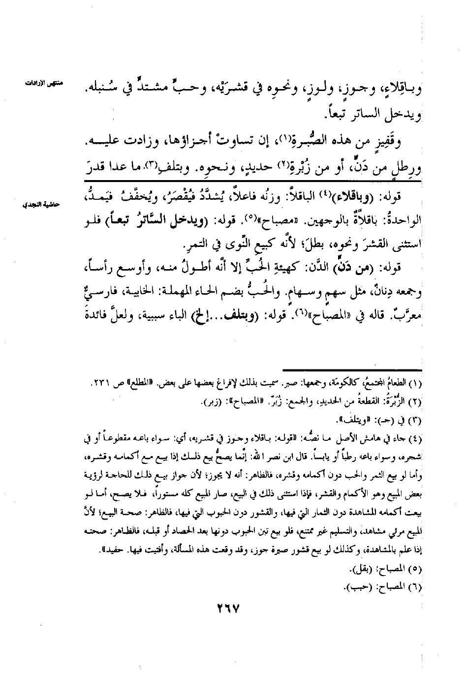 وبَاقِلَّاء وجَوْزٍ وَلَوْزٍ وَنَحْوِهِ فِي قِشْرَيْهِ وحَبٍّ مُشْتَدٍّ فِي سُنْبُلِهِ وَيَدْخُلُ السَّاتِرُ تَبَعًا وقَفِيزٍ مِنْ هَذِهِ الصُّبْرَةِ إنْ تَسَاوَتْ أَجْزَاؤُهَا وَزَادَتْ عَلَيْهِ ورِطْلٍ مِنْ دَنٍّ أَوْ مِنْ زُبْرَةِ حَدِيدٍ وَنَحْوِهِ وَبِتَلَفِ مَا عَدَا قَدْرَ
