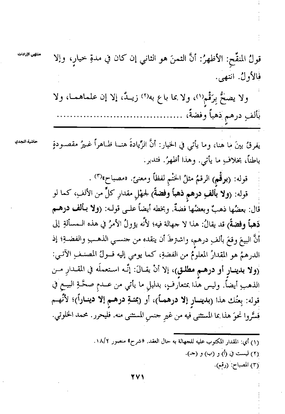 قَوْلُ الْمُنَقِّحِ الْأَظْهَرُ أَنَّ الثَّمَنَ هُوَ الثَّانِي إنْ كَانَ فِي مُدَّةِ خِيَارِ وَإِلَّا فالْأَوَّلُ، انْتَهَى وَلَا يَصِحُّ بِرَقْمِهِ وَلَا بِمَا بَاعَ بِهِ زَيْدٌ إلَّا إنْ عَلِمَاهُمَا وَلَا بِأَلْفِ دِرْهَمٍ ذَهَبًا وَفِضَّةً
