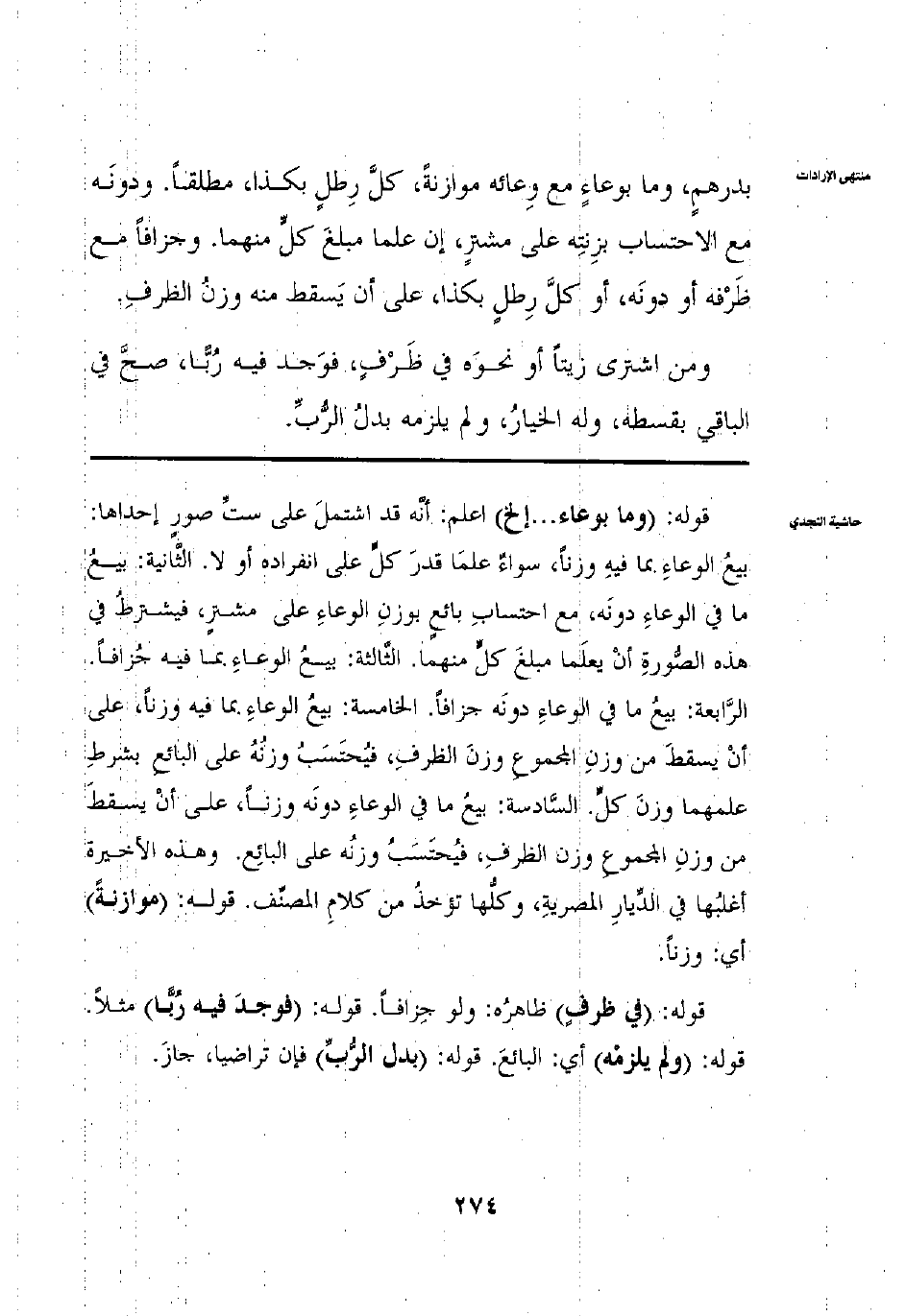 بِدِرْهَمٍ ومَا بِوِعَاءٍ مَعَ وِعَائِهِ مُوَازَنَةُ كُلِّ رِطْلٍ بِكَذَا مُطْلَقًا ودُونَهُ مَعَ الِاحْتِسَابِ بِزِنَتِهِ عَلَى مُشْتَرٍ إنْ عَلِمَا مَبْلَغَ كُلٍّ مِنْهُمَا وجُزَافًا مَعَ ظَرْفِهِ أَوْ دُونَهُ أَوْ كُلَّ رِطْلٍ بِكَذَا عَلَى أَنْ يَسْقُطَ مِنْهُ وَزْنُ الظَّرْفِ وَمَنْ اشْتَرَى زَيْتًا أَوْ نَحْوَهُ فِي ظَرْفٍ فَوَجَدَ فِيهِ رُبًّا صَحَّ فِي الْبَاقِي بِقِسْطِهِ وَلَهُ الْخِيَارُ وَلَمْ يَلْزَمْهُ بَدَلُ الرُّبِّ