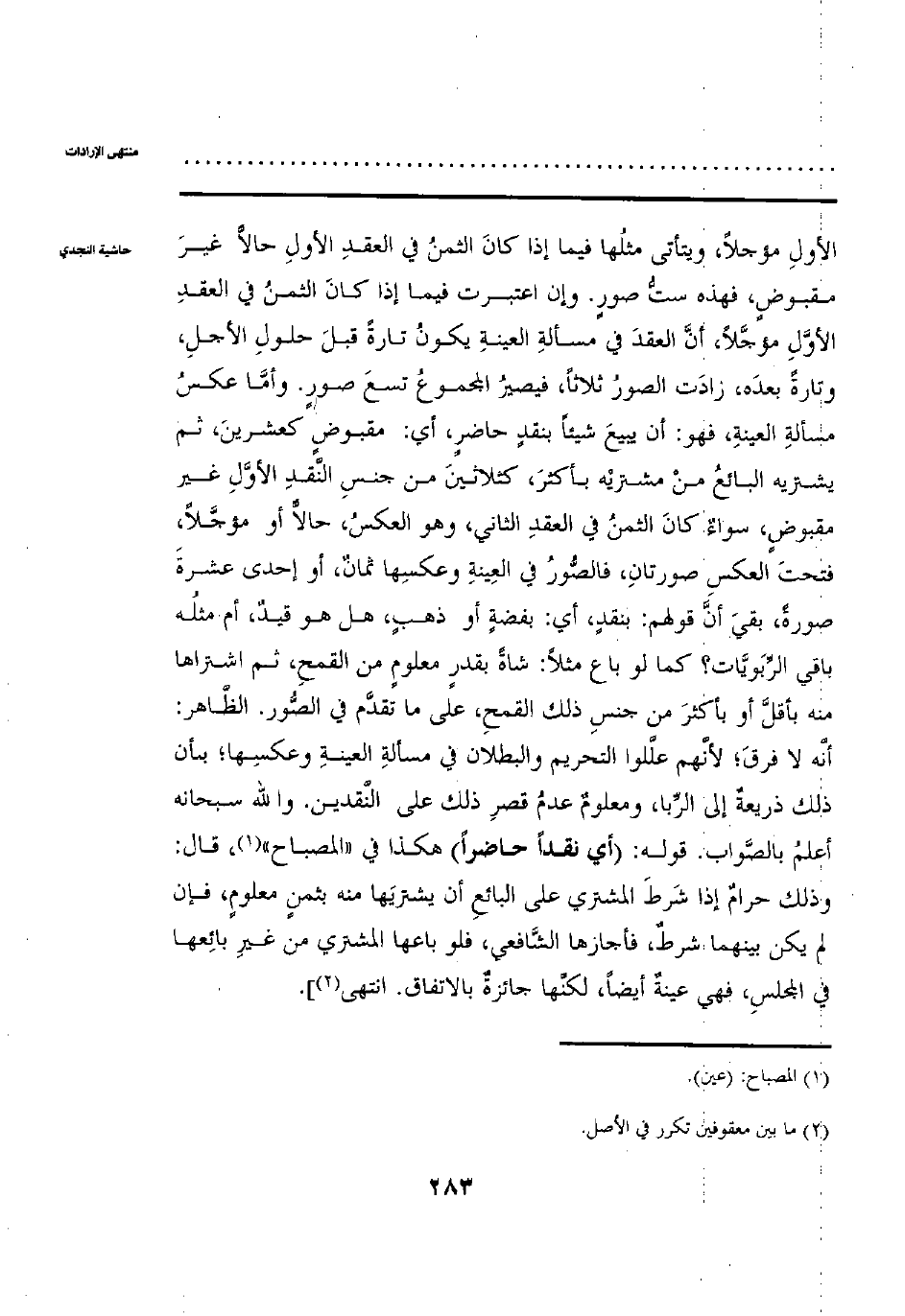 الأول مؤجلا، ويتأتى مثلها فيما إذا كان الثمن في العقد الأول حالا غير مقبوض، فهذه ست صور. وإن اعتبرت فيما إذا كان الثمن في العقد الأول مؤجلا، أن العقد في مسألة العينة يكون تارة قبل حلول الأجل، وتارة بعده، زادت الصور ثلاثا، فيصير المجموع تسع صور. وأما عكس مسألة العينة، فهو: أن يبيع شيئاً بنقد حاضر، أي: مقبوض كعشرين، ثم يشتريه البائع من مشتريه بأكثر، كثلاثين من جنس النقد الأول غير مقبوض، سواء كان الثمن في العقد الثاني، وهو العكس، حالا أو مؤجلا، فتحت العكس صورتان، فالصور في العينة وعكسها ثمان، أو إحدى عشرة صورة، بقي أن قولهم: بنقدٍ، أي: بفضة أو ذهب، هل هو قيد، أم مثله باقي الربويات؟ كما لو باع مثلا: شاة بقدر معلومٍ من القمح، ثم اشتراها منه بأقل أو بأكثر من جنس ذلك القمح، على ما تقدم في الصور. الظاهر: أنه لا فرق؛ لأنهم عللوا التحريم والبطلان في مسألة العينة وعكسها؛ بأن ذلك ذريعة إلى الربا، ومعلوم عدم قصر ذلك على النقدين. والله سبحانه أعلم بالصواب. قوله: (أي نقدا حاضرا) هكذا في «المصباح»، قال: وذلك حرام إذا شرط المشتري على البائع أن يشتريها منه بثمن معلوم، فإن لم يكن بينهما شرط، فأجازها الشافعي، فلو باعها المشتري من غير بائعها في المجلس، فهي عينة أيضا، لكنها جائزة بالاتفاق. انتهى].