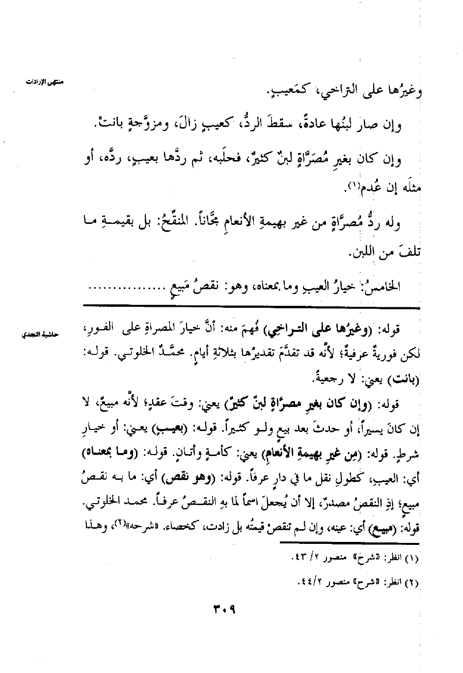 وغَيْرِهَا عَلَى التَّرَاخِي كمَعِيبٍ وَإِنْ صَارَ لَبَنُهَا عَادَةً سَقَطَ الرَّدُّ كَعَيْبٍ زَالَ ومُزَوَّجَةٍ بَانَتْ وَإِنْ كَانَ بِغَيْرِ مُصَرَّاةِ لَبَنٍ كَثِيرٍ فَحَلَبَهُ ثُمَّ رَدَّهَا بِعَيْبٍ رَدَّهُ أَوْ مِثْلَهُ إنْ عَدِمَؤ وَلَهُ رَدُّ مُصَرَّاةٍ مِنْ غَيْرِ بَهِيمَةِ الْأَنْعَامِ مَجَّانًا الْمُنَقِّحُ: بَلْ قِيمَةُ مَا تَلِفَ مِنْ اللَّبَنِ الْخَامِسُ: خِيَارُ الْعَيْبِ وَمَا بِمَعْنَاهُ وَهُوَ نَقْصُ مَبِيعٍ