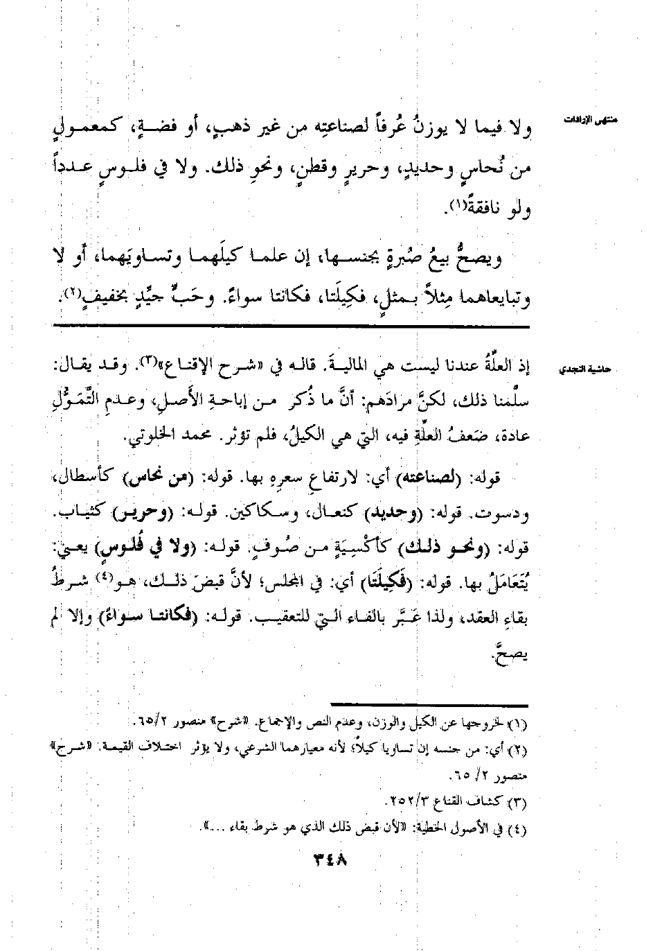 وَلَا فِيمَا لَا يُوزَنُ عُرْفًا لِصِنَاعَةٍ مِنْ غَيْرِ ذَهَبٍ أَوْ فِضَّةٍ كَمَعْمُولٍ مِنْ نُحَاسٍ وحَدِيدٍ وحَرِيرٍ وَقُطْنٍ ونَحْوِ ذَلِكَ وَلَا فِي فُلُوسٍ عَدَدًا وَلَوْ نَافِقَةً وَيَصِحُّ بَيْعُ صُبْرَةٍ بجِنْسِهَا وَإِنْ عَلِمَا كَيْلَهُمَا وتَسَاوِيَهُمَا أَوْ لَا وَتَبَايَعَاهُمَا مِثْلًا بِمِثْلٍ فَكِيلَتَا فَكَانَتَا سَوَاءً وحَبٍّ جَيِّدٍ بخَفِيفٍ