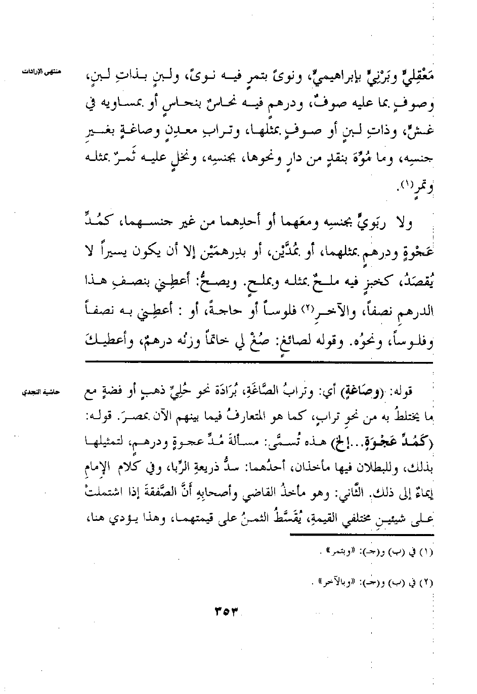 مَعْقِلِيٍّ وَبَرْنِيِّ بِإِبْرَاهِيمِيِّ ونَوَى بِتَمْرٍ فِيهِ نَوًى ولَبَنٍ بِذَاتِ لَبَنٍ وصُوفٍ بِمَا عَلَيْهِ صُوفٌ ودِرْهَمٍ فِيهِ نُحَاسٌ ِنُحَاسٍ أَوْ بمُسَاوِيهِ فِي غَشٍّ وذَاتِ لَبَنٍ أَوْ صُوفٍ بِمِثْلِهَا وتُرَابِ مَعْدِنٍ وصَاغَةٍ بِغَيْرِ جِنْسِهِ ومَا مُوِّهَ بِنَقْدٍ مِنْ دَارٍ وَنَحْوِهَا بِجِنْسِهِ ونَخْلٍ عَلَيْهِ تَمْرٌ بِمِثْلِهِ أَوْ تَمْرٍ لَا رِبَوِيٍّ بِجِنْسِهِ وَمَعَهُمَا أَوْ أَحَدِهِمَا مِنْ غَيْرِ جِنْسِهِمَا كَمُدِّ عَجْوَةٍ وَدِرْهَمٍ بِمِثْلِهِمَا أَوْ بِمُدَّيْنِ أَوْ بِدِرْهَمَيْنِ إلَّا أَنْ يَكُونَ يَسِيرًا لَا يُقْصَدُ كَخُبْزٍ فِيهِ مِلْحٌ بِمِثْلِهِ وبِمِلْحٍ وَيَصِحُّ أَعْطِنِي بِنِصْفِ هَذَا الدِّرْهَمِ نِصْفًا والْآخَرِ فُلُوسًا أَوْ حَاجَةًأَوْ أَعْطِنِي بِهِ نِصْفًا وَفُلُوسًا وَنَحْوِهِ وقَوْلُهُ لِصَائِغٍ صُغْ لِي خَاتَمًا وَزْنُهُ دِرْهَمٌ أُعْطِيَكَ
