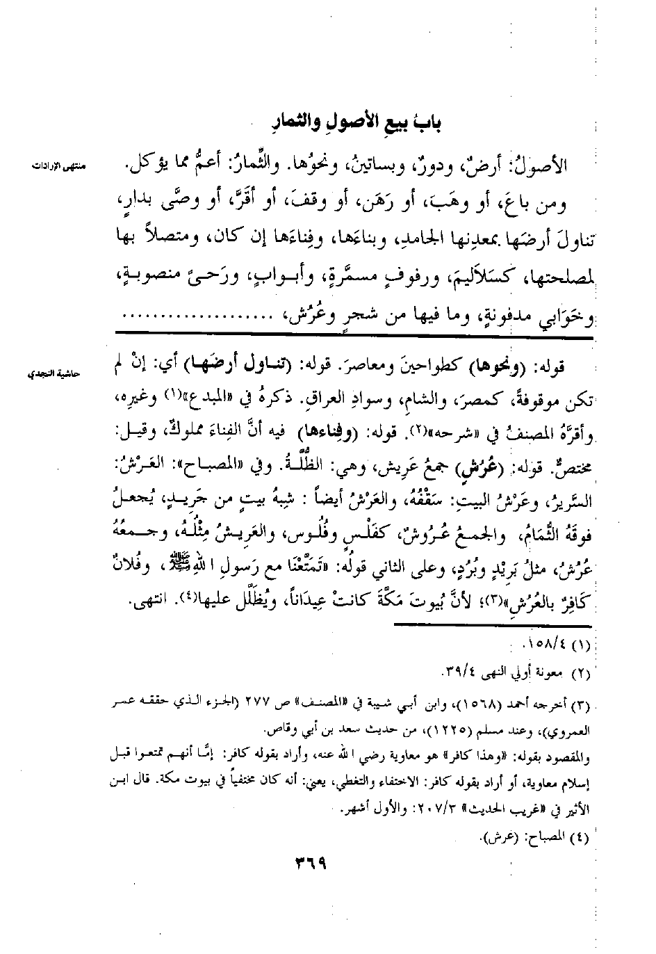 الْأُصُولُ: أَرْضٌ وَدُورٌ وَبَسَاتِينُ وَنَحْوُهَا وَالثِّمَارُ أَعَمُّ مِمَّا يُؤْكَلُ وَمَنْ بَاعَ أَوْ وَهَبَ أَوْ رَهَنَ أَوْ وَقَفَ أَوْ أَقَرَّ أَوْ أَوْصَى بِدَارِ تَنَاوَلَ أَرْضَهَا بِمَعْدَنِهَا الْجَامِدِ وبِنَاءَهَا وفِنَاءَهَا إنْ كَانَ ومُتَّصِلًا بِهَا لِمَصْلَحَتِهَا كَسَلَالِمَ ورُفُوفٍ مُسَمَّرَةٍ وأَبْوَابٍ مَنْصُوبَةٍ ورَحًى مَنْصُوبَةٍ وخَوَابٍ مَدْفُونَةٍ ومَا فِيهَا مِنْ شَجَرٍ وعُرُشٍ