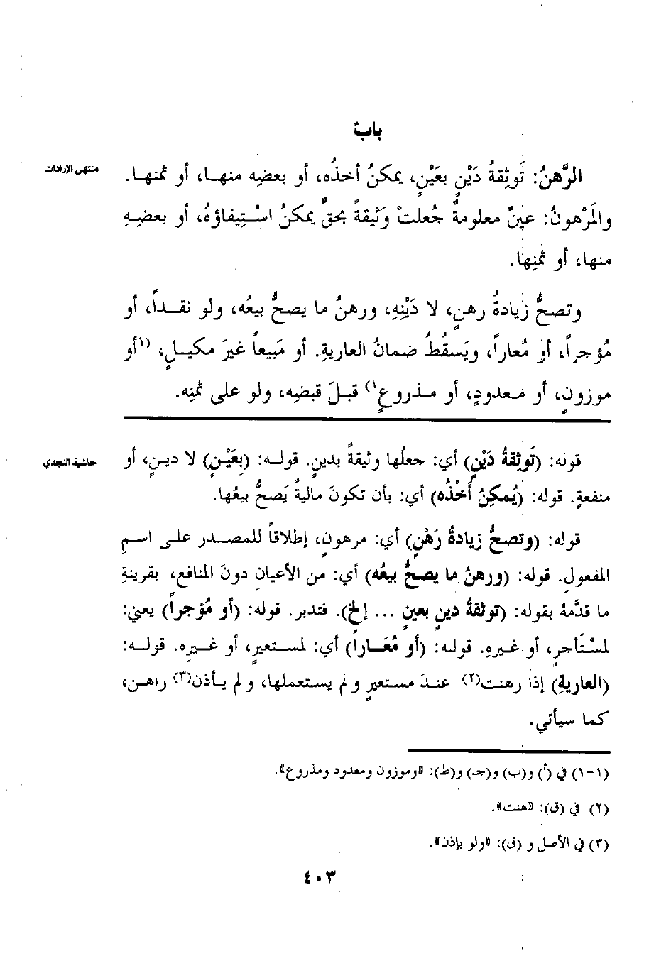 الرهن: تَوْثِقَةُ دَيْنٍ بِعَيْنٍ يُمْكِنُ أَخْذُهُ وبَعْضِهِ مِنْهَا أَوْ ثَمَنِهَا وَالْمَرْهُونُ عَيْنٌ مَعْلُومَةٌ جُعِلَتْ وَثِيقَةً بِحَقٍّ يُمْكِنُ اسْتِيفَاؤُهُ أَوْ بَعْضِهِ مِنْهَا أَوْ مِنْ ثَمَنِهَا وَتَصِحُّ زِيَادَةُ رَهْنٍ لَا دَيْنِهِ ورَهْنُ مَا يَصِحُّ بَيْعُهُ وَلَوْ نَقْدًا أَوْ مُؤَجَّرًا أَوْ مُعَارًا وَيَسْقُطُ ضَمَانُ الْعَارِيَّةِ أَوْ مَبِيعًا غَيْرَ مَكِيلٍ وَمَوْزُونٍ وَمَعْدُودٍ وَمَذْرُوعٍ قَبْلَ قَبْضِهِ وَلَوْ عَلَى ثَمَنِهِ