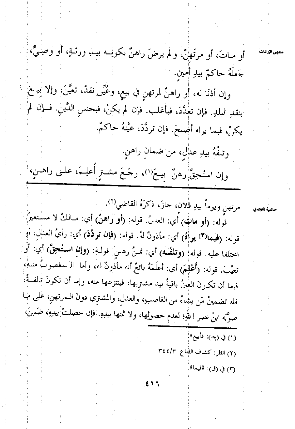 أَوْ مَاتَ أَوْ مُرْتَهِنٌ وَلَمْ يَرْضَ رَاهِنٌ بِكَوْنِهِ بِيَدِ وَرَثَةٍ أَوْ وَصِيٍّ جَعَلَهُ حَاكِمٌ بِيَدِ أَمِينٍ وَإِنْ أَذِنَا لَهُ أَوْ رَاهِنٌ لِمُرْتَهِنٍ فِي بَيْعِ وَعُيِّنَ نَقْدٌ تَعَيَّنَ وَإِلَّا بِيعَ بِنَقْدِ الْبَلَدِ فَبِأَغْلَبِ فبِجِنْسِ الدَّيْنِ فبِمَا يَرَاهُ أَصْلَحَ عَيَّنَهُ حَاكِمٌ وَتَلَفُهُ بِيَدِ عَدْلٍ مِنْ ضَمَانِ رَاهِنٍ وَإِنْ اُسْتُحِقَّ رَهْنٌ بِيعَ رَجَعَ مُشْتَرٍ، أُعْلِمَ عَلَى رَاهِنٍ