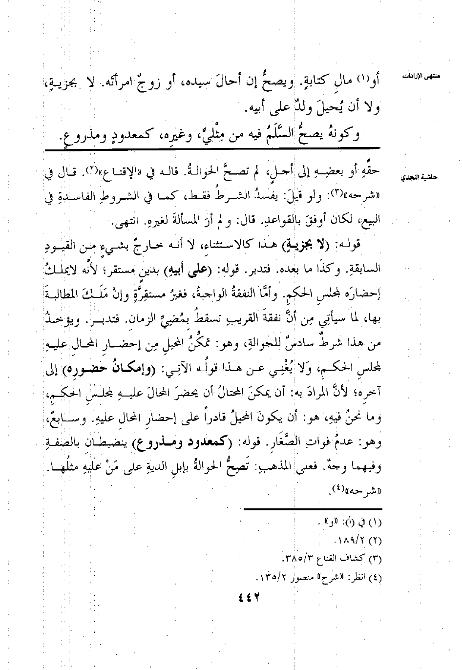 أَوْ مَالِ كِتَابَةٍ وَيَصِحُّ إنْ أَحَالَ سَيِّدَهُ أَوْ زَوْجٌ امْرَأَتَهُ لَا بِجِزْيَةٍ وَلَا أَنْ يُحِيلَ وَلَدٌ عَلَى أَبِيهِ وكَوْنُهُ يَصِحُّ السَّلَمُ فِيهِ مِنْ مِثْلِيٍّ وَغَيْرِهِ كَمَعْدُودٍ وَمَذْرُوعٍ