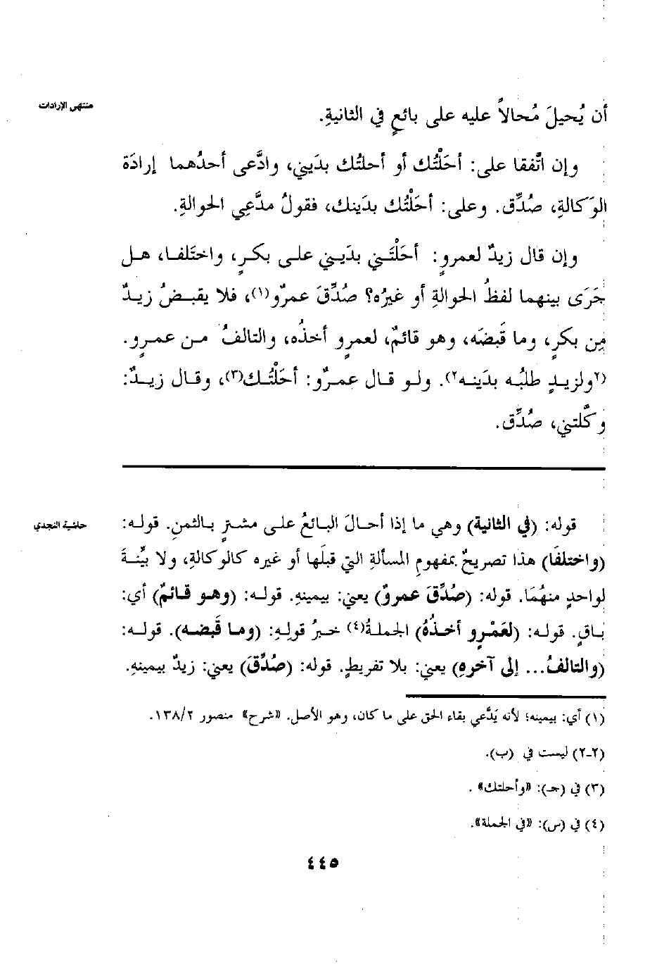 أَنْ يُحِيلَ مُحَالًا عَلَيْهِ عَلَى بَائِعٍ فِي الثَّانِيَةِ وَإِنْ اتَّفَقَا عَلَى أَحَلْتُك أَوْ أَحَلْتُك بِدَيْنِي وَادَّعَى أَحَدُهُمَا إرَادَةَ الْوَكَالَةِ صُدِّقَ وعَلَى أَحَلْتُك بِدَيْنِكَ فَقَوْلُ مُدَّعِي الْحَوَالَةِ وَإِنْ قَالَ زَيْدٌ لِعَمْرٍو: أَحَلْتنِي بِدَيْنِي عَلَى بَكْرٍ وَاخْتَلَفَا هَلْ جَرَى بَيْنَهُمَا لَفْظُ الْحَوَالَةِ أَوْ غَيْرُهُ؟ صُدِّقَ عَمْرٌو فَلَا يَقْبِضُ زَيْدٌ مِنْ بَكْرٍ وَمَا قَبَضَهُ وَهُوَ قَائِمٌ لِعَمْرٍو أَخْذُهُ وَالتَّالِفُ مِنْ عَمْرٍو وَلِزَيْدٍ طَلَبُهُ بِدَيْنِهِ وَلَوْ قَالَ عَمْرٌو أَحَلْتُك وَقَالَ زَيْدٌ: وَكَّلْتَنِي صُدِّقَ