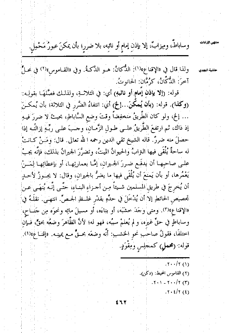 وسَابَاطٌ وَمِيزَابٌ إلَّا بِإِذْنِ إمَامٍ أَوْ نَائِبِهِ بِلَا ضَرَرٍ بِأَنْ يُمْكِنَ عُبُورُ مَحْمَلٍ