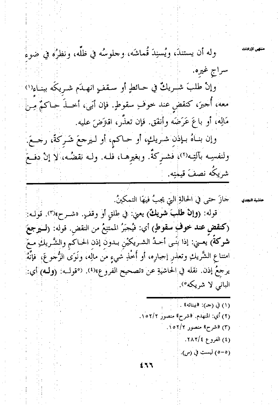 وَلَهُ أَنْ يَسْتَنِدَ ويُسْنِدَ قُمَاشَهُ وَجُلُوسَهُ فِي ظِلِّهِ ونَظَرُهُ فِي ضَوْءِ سِرَاجِ غَيْرِهِ وَإِنْ طَلَبَ شَرِيكٌ فِي حَائِطٍ أَوْ سَقْفٍ انْهَدَمَ شَرِيكَهُ أُجْبِرَ كَنَقْضِهِ عِنْدَ خَوْفِ سُقُوطِ أَخَذَ حَاكِمٌ مِنْ مَالِهِ أَوْ بَاعَ عَرْضَهُ وَأَنْفَقَ اقْتَرَضَ عَلَيْهِ وَإِنْ بَنَاهُ بِإِذْنِ شَرِيكِهِ حَاكِمٍ أَوْ لِيَرْجِعَ شَرِكَةً رَجَعَ ولِنَفْسِهِ بِآلَتِهِ فشَرِكَةٌ وبِغَيْرِهَا فلَهُ وَلَهُ نَقْضُهُ لَا إنْ دَفَعَ شَرِيكُهُ نِصْفَ قِيمَتِهِ