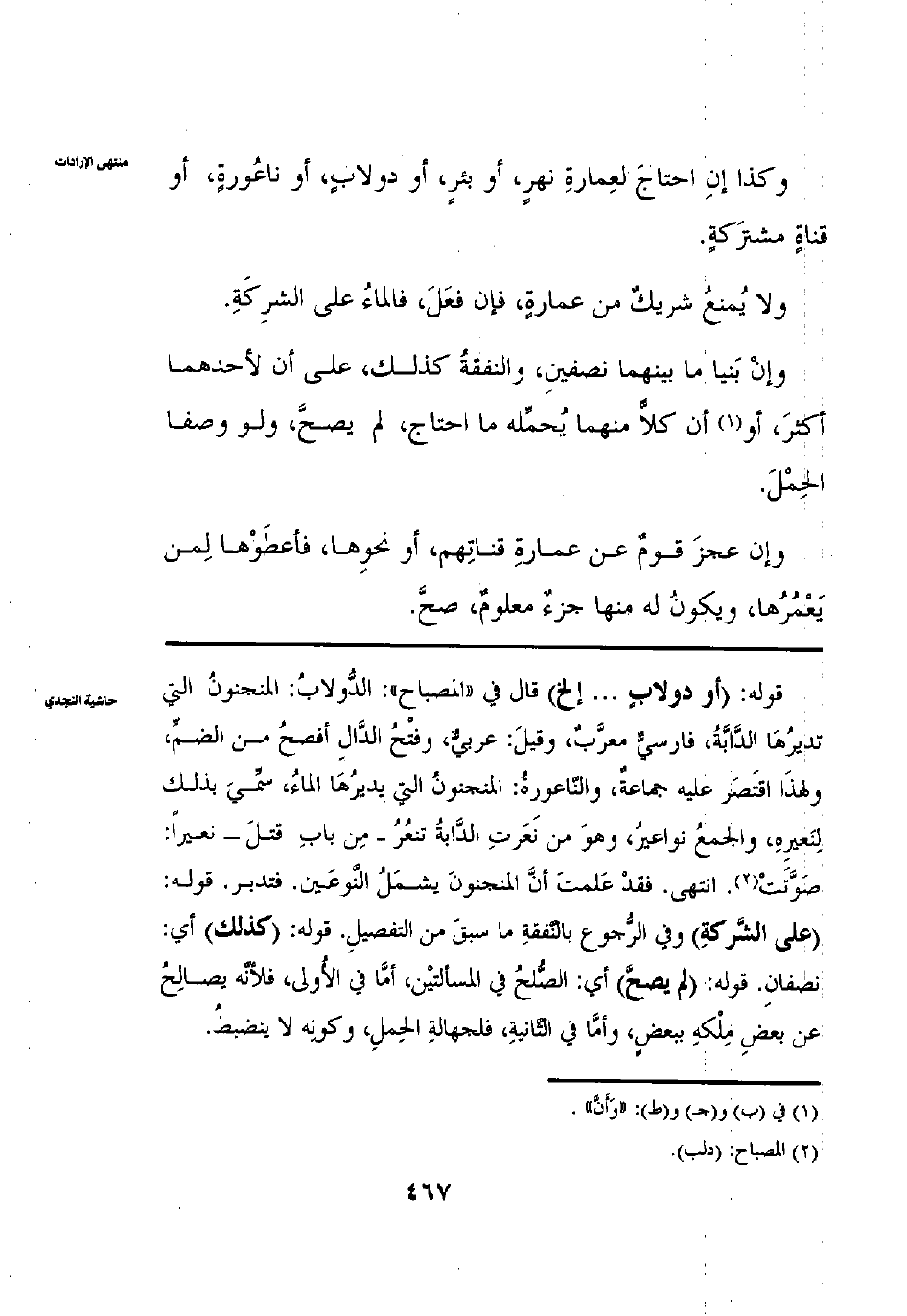 وَكَذَا إنْ احْتَاجَ لِعِمَارَةِ نَهْرٍ أَوْ بِئْرٍ أَوْ دُولَابٍ أَوْ نَاعُورَةٍ أَوْ قَنَاةٍ مُشْتَرَكَةٍ وَلَا يُمْنَعُ شَرِيكٌ مِنْ عِمَارَةِ فَالْمَاءُ عَلَى الشَّرِكَةِ وَإِنْ بَنَيَا مَا بَيْنَهُمَا نِصْفَيْنِ وَالنَّفَقَةُ كَذَلِكَ عَلَى أَنَّ لِأَحَدِهِمَا أَكْثَرَ أَوْ أَنَّ كُلًّا مِنْهُمَا يَحْمِلُهُ مَا احْتَاجَ لَمْ يَصِحَّ، وَلَوْ وَصَفَا الْحَمْلَ وَإِنْ عَجَزَ قَوْمٌ عَنْ عِمَارَةِ قَنَاتِهِمْ أَوْ نَحْوِهَا فَأَعْطَوْهَا لِمَنْ يُعَمِّرُهَا وَيَكُونُ مِنْهَا جُزْءٌ مَعْلُومٌ صَحَّ