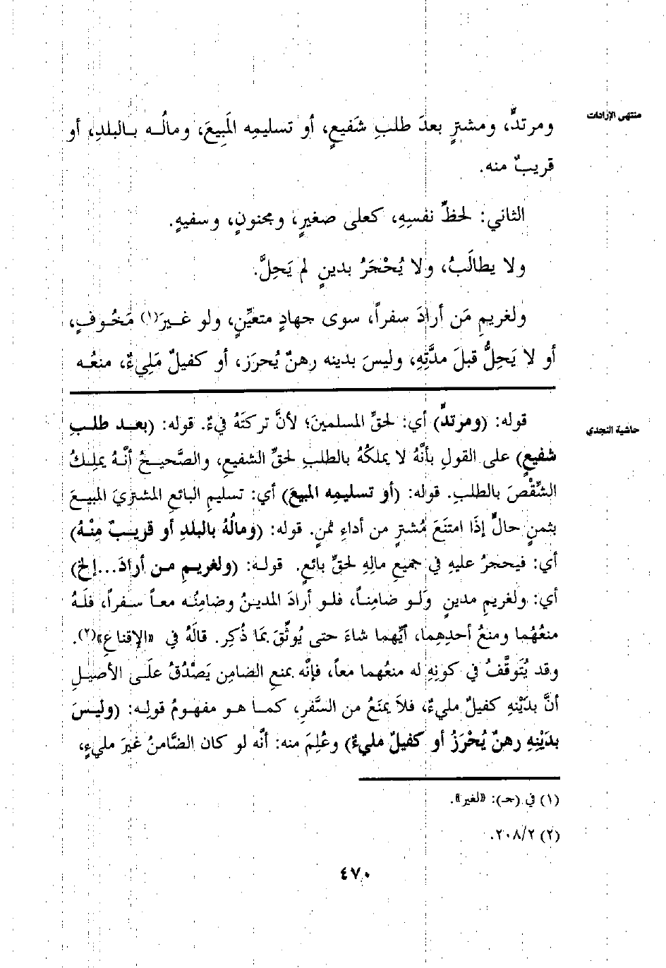 ومُرْتَدٍّ ومُشْتَرٍ بَعْدَ طَلَبِ شَفِيعٍ أَوْ تَسْلِيمِهِ الْمَبِيعَ وَمَالُهُ بِالْبَلَدِ أَوْ قَرِيبٍ مِنْهُ الثَّانِي لِحَظِّ نَفْسِهِ ك عَلَى صَغِيرٍ وَسَفِيهٍ وَمَجْنُونٍ وَلَا يُطَالَبُ وَلَا يُحْجَرُ بِدَيْنٍ لَمْ يَحِلَّ وَلِغَرِيمٍ مِنْ أَرَادَ سَفَرًا سِوَى جِهَادٍ مُتَعَيَّنٍ وَلَوْ غَيْرَ مَخُوفٍ أَوْ لَا يَحِلُّ قَبْلَ مُدَّتِهِ وَلَيْسَ بِدَيْنِهِ رَهْنٌ يُحْرَزُ أَوْ كَفِيلٌ مَلِيءٌ مَنْعُهُ