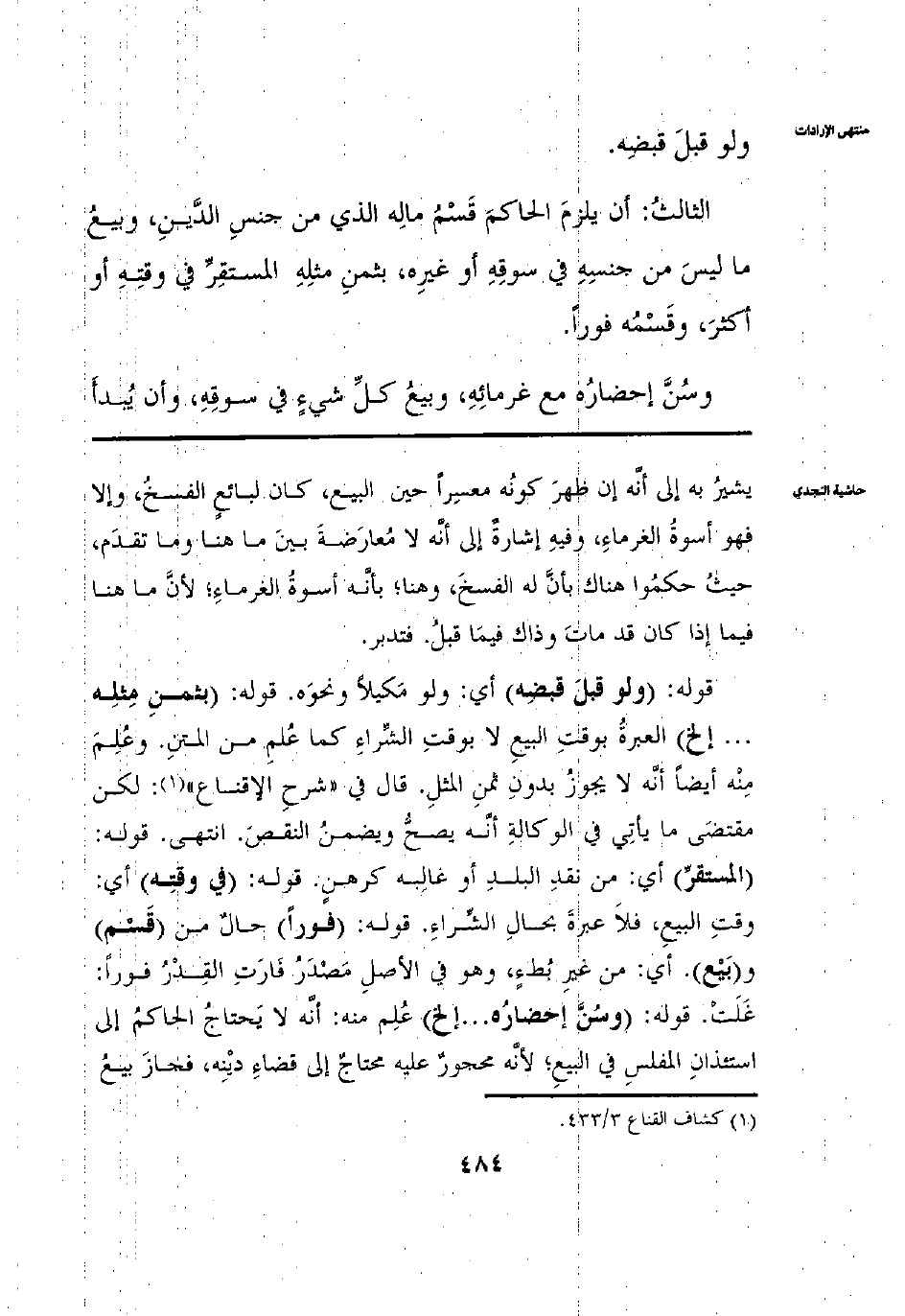 وَلَوْ قَبْلَ قَبْضِهِ الثَّالِثُ أَنْ يَلْزَمَ الْحَاكِمَ قَسْمُ مَالِهِ الَّذِي مِنْ جِنْسِ الدَّيْنِ وبَيْعُ مَا لَيْسَ مِنْ جِنْسِهِ فِي سُوقِهِ أَوْ غَيْرِهِ بِثَمَنِ مِثْلِهِ الْمُسْتَقِرِّ فِي وَقْتِهِ أَوْ أَكْثَرَ وَقَسَمَهُ فَوْرًا وَسُنَّ إحْضَارُهُ مَعَ غُرَمَائِهِ وبَيْعُ كُلِّ شَيْءٍ فِي سُوقِهِ وأَنْ يَبْدَأَ