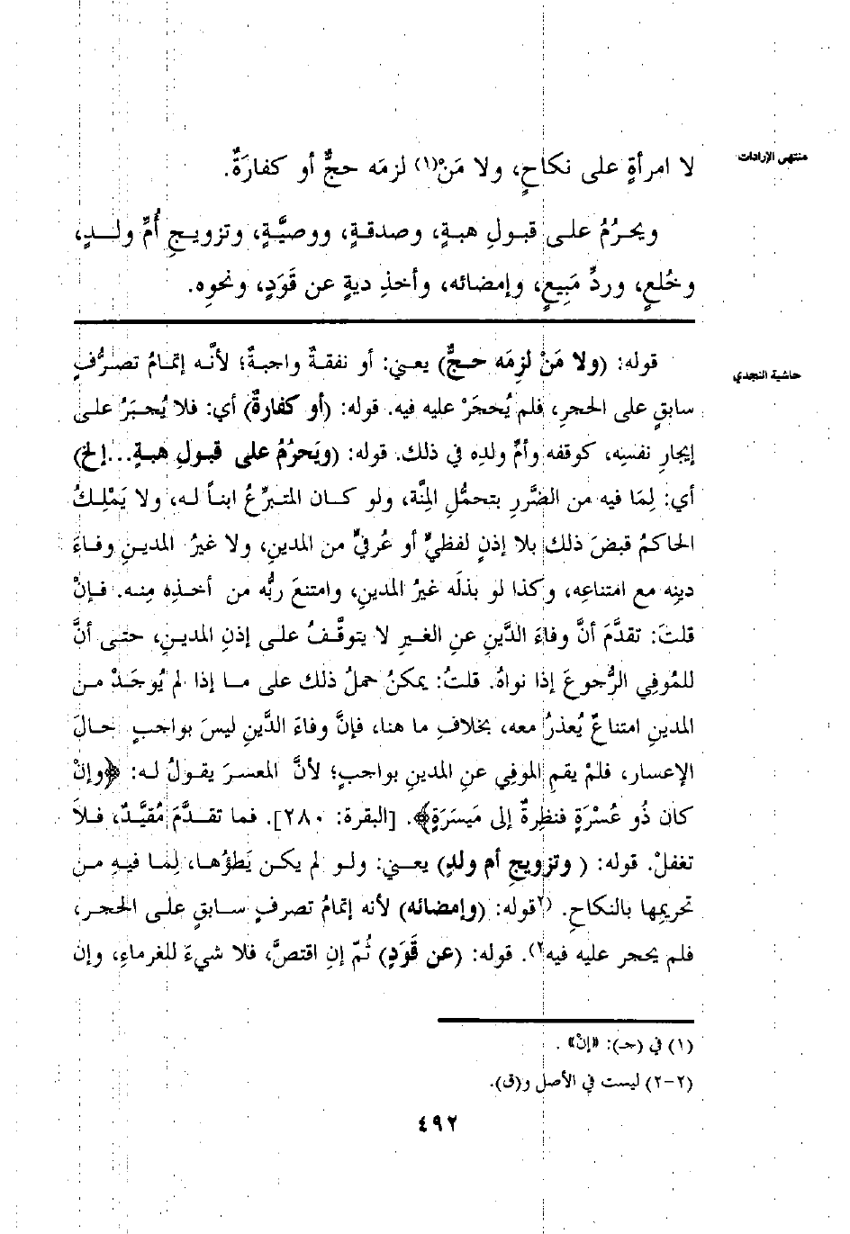 لَا امْرَأَةٌ عَلَى نِكَاحٍ وَلَا مَنْ لَزِمَهُ حَجٌّ أَوْ كَفَّارَةٌ وَيَحْرُمُ عَلَى قَبُولِ هِبَةٍ وصَدَقَةٍ ووَصِيَّةٍ وتَزْوِيجِ أُمِّ وَلَدٍ وخُلْعِ عَلَى عِوَضٍ يُوَفِّي مِنْهُ دَيْنَهُ ورَدِّ مَبِيعٍ وإمْضَائِهِ وأَخْذِ دِيَةٍ عَنْ قَوَدٍ ونَحْوِهِ